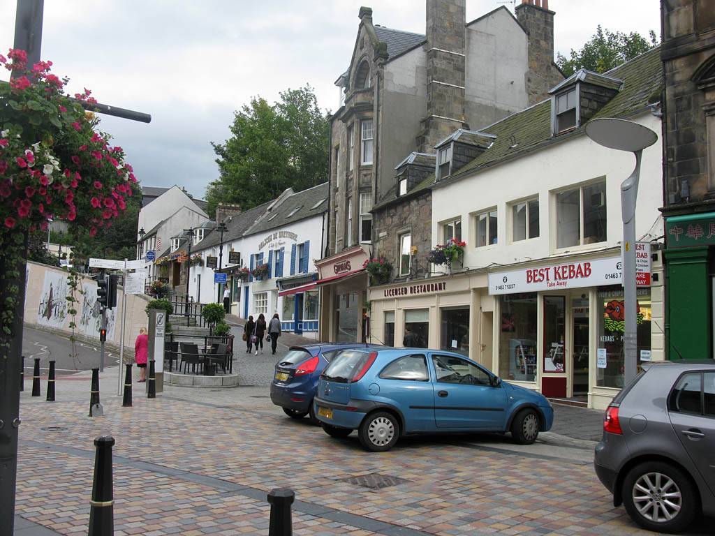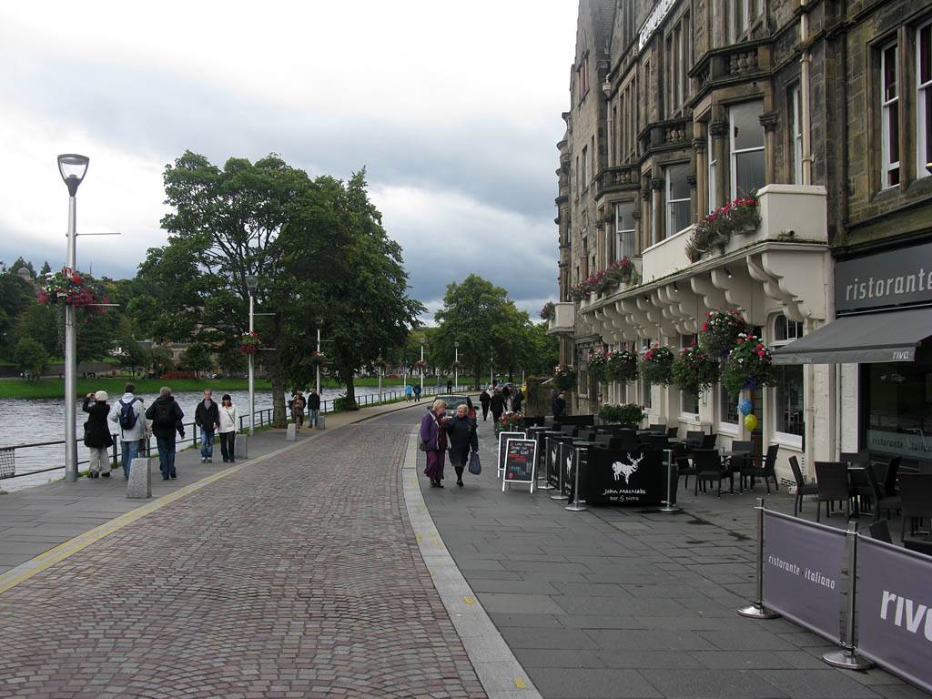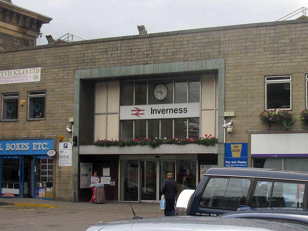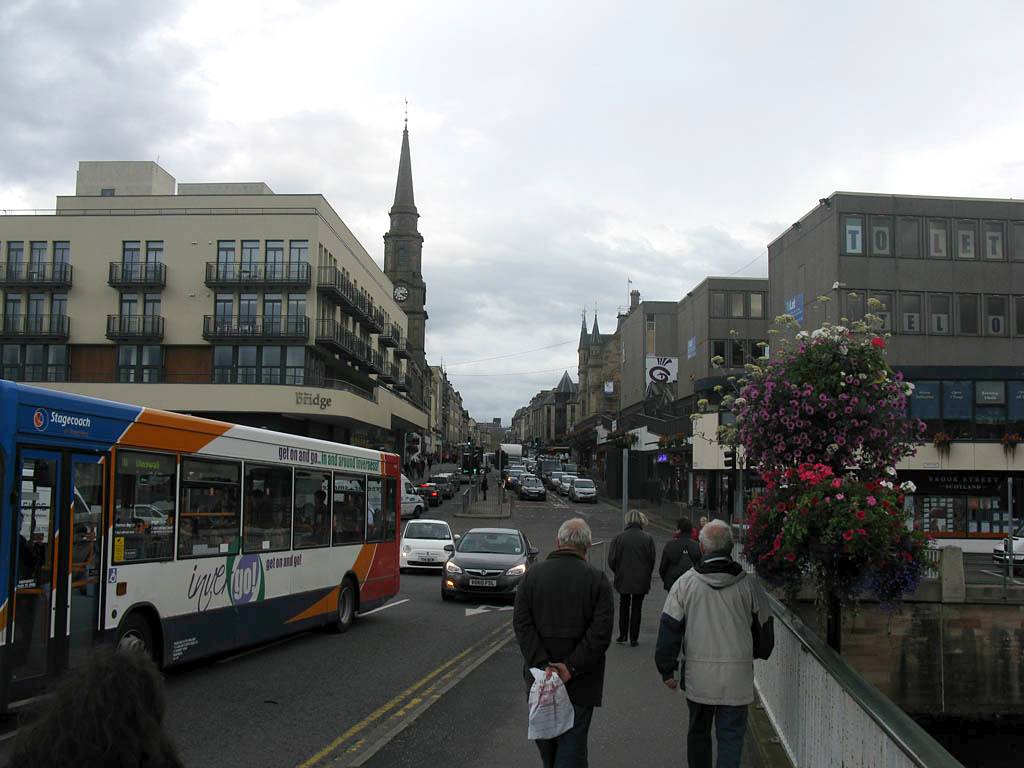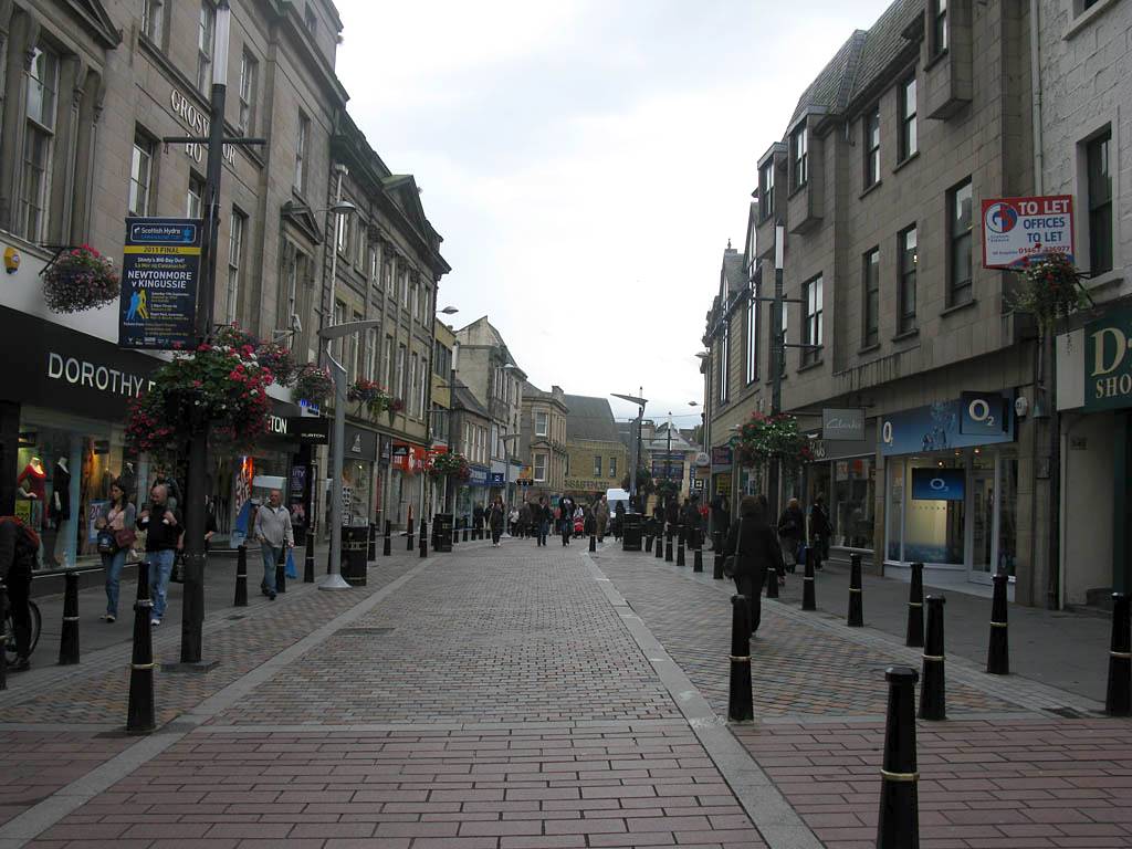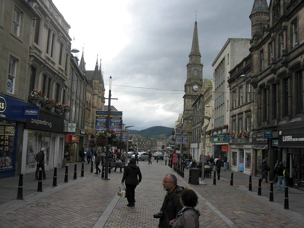 Looking up the High Street. | Looking North and South on the pedestrianised part of the High Street. | The Eastgate shopping centre. Is this the most northerly shopping centre in the country? | A small corner of Inverness with a continental feel to it. | Inverness train station. Admittedly none too special looking from the outside. |
