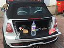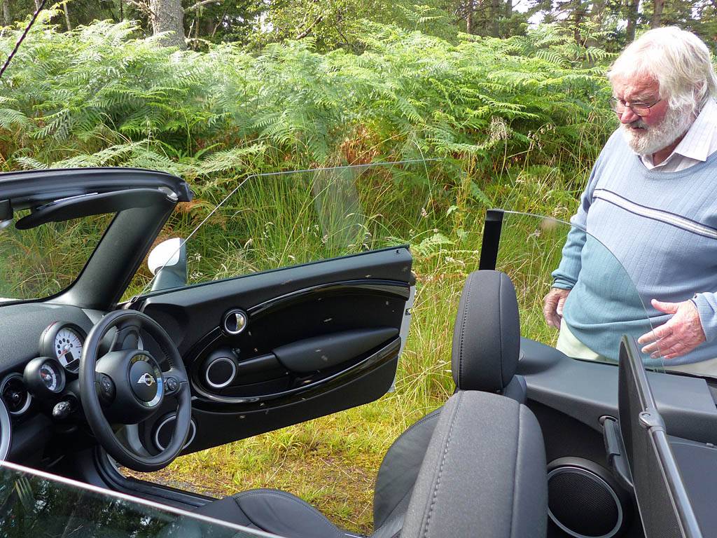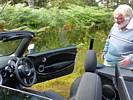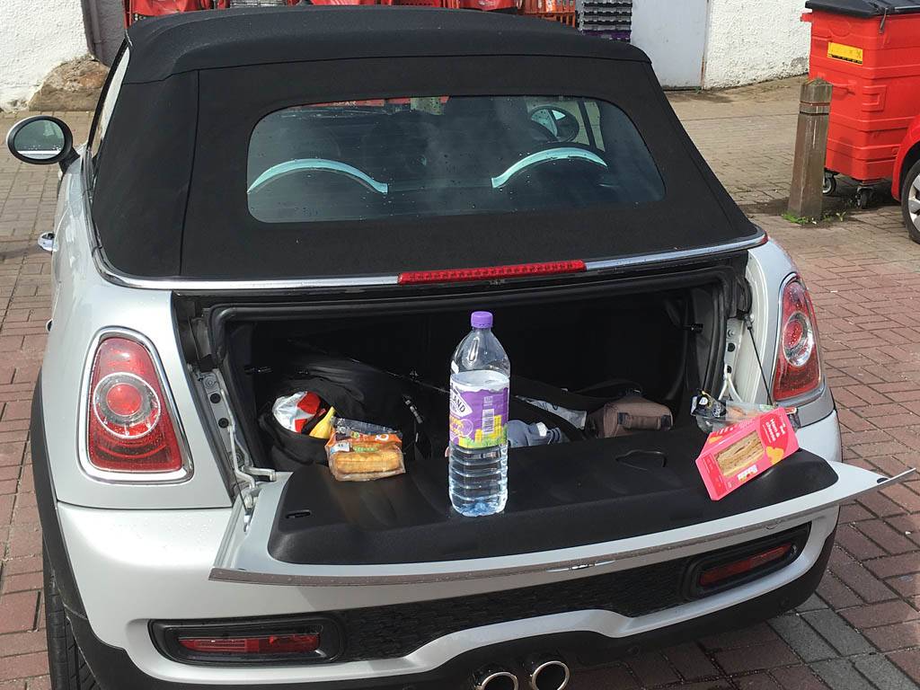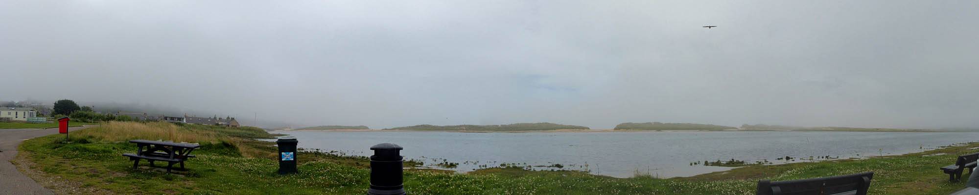 At 2:30PM we arrived at Lossiemouth after driving past the RAF air base. It was a pretty looking place with a bustling main street with bunting, and a bar of sand dunes across the River Lossie Estuary accessed via a bridge. We didn't get out of the car though. The haar was thicker here and I was feeling cold and tired. But after a little while we decided to go back the way we came. Up ahead, incoming from the Southwest was a thunderstorm. As the sky darkened we put the roof back up and continued. Indeed we drove through heavy rain which thankfully cleared as we got back to Lethen at 3:30PM.