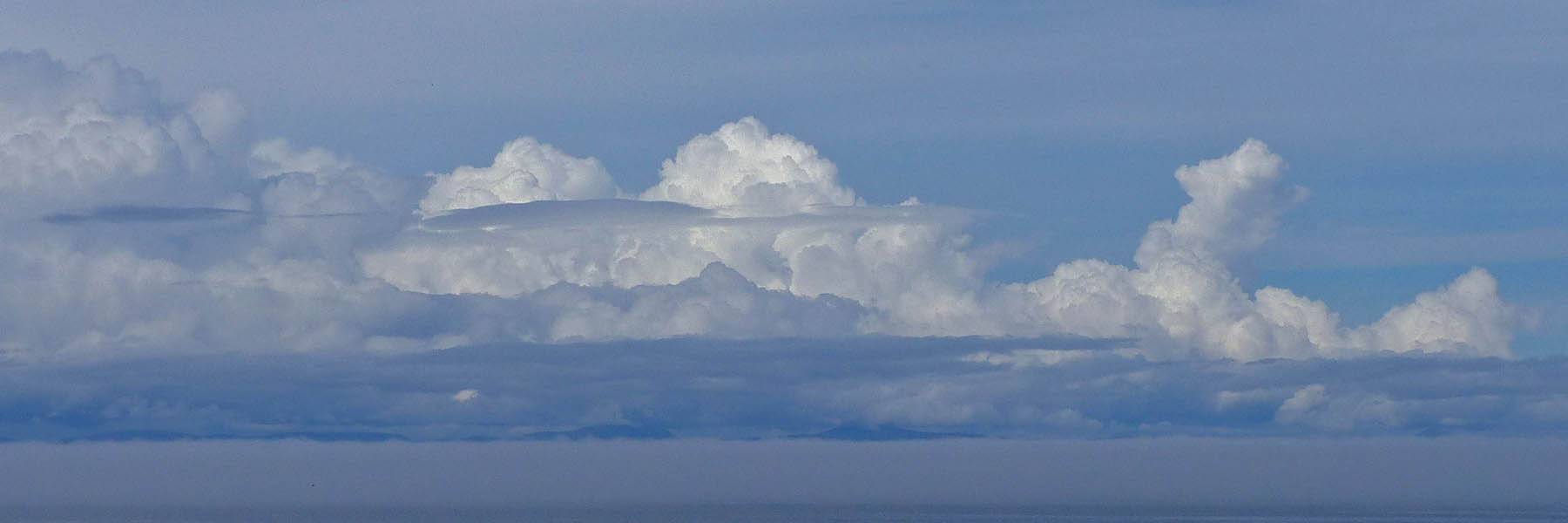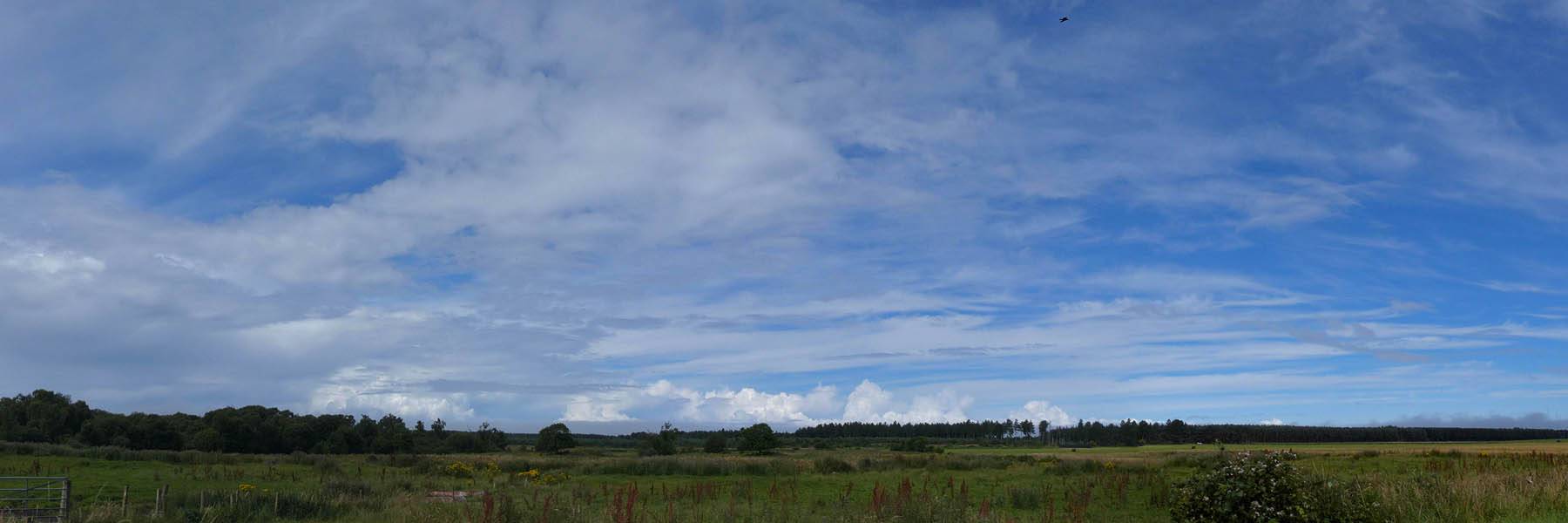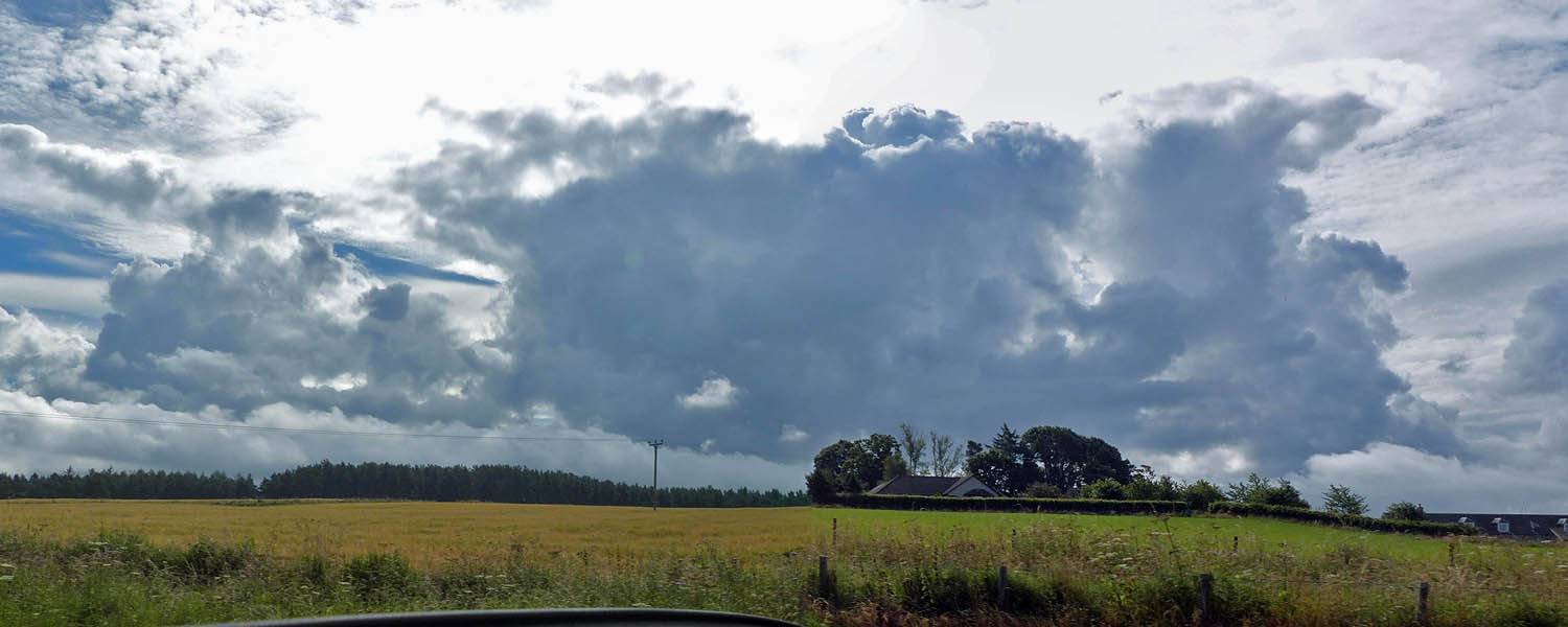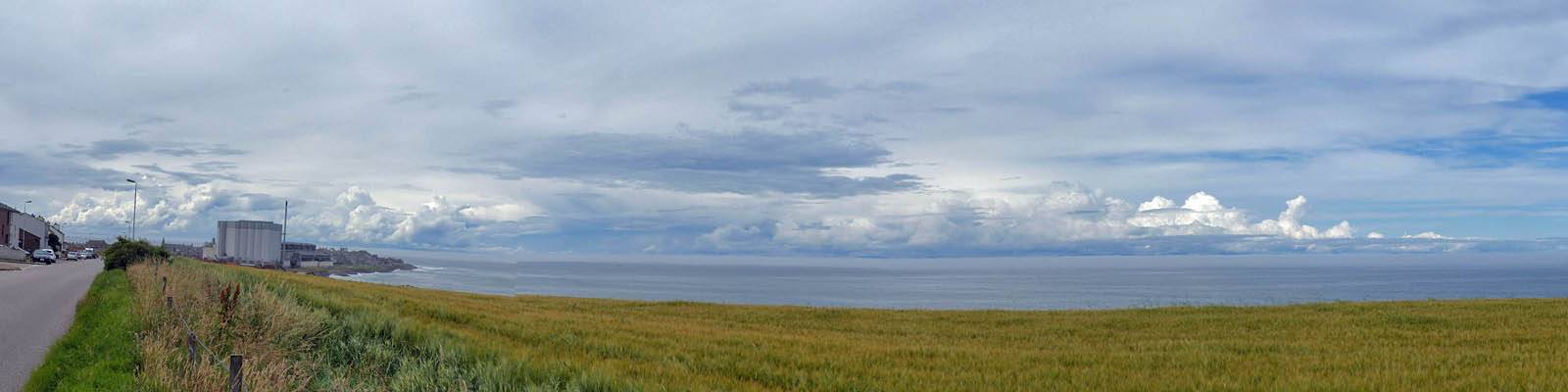 At 1:45PM, after a pause at a local corner shop we drove East along the coast in clear air to some spectacular views. Behind and below us was the Burghead peninsula. A haar layer was visible in the Moray Firth, and beyond to the North over Caithness (where hills poked up out of the fog from our viewpoint) and to the West huge cumulonimbus clouds were building. It was very hard to take pictures in the challenging light conditions but the view was epic!