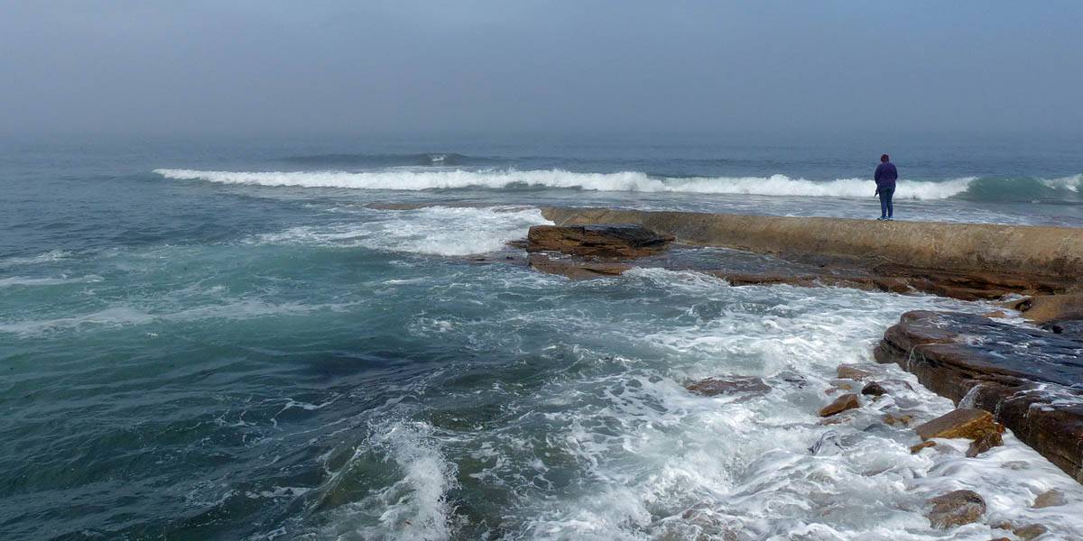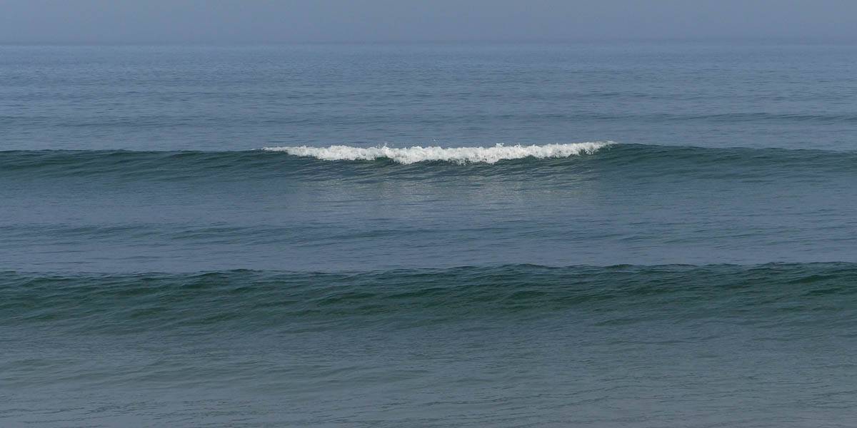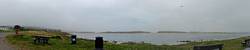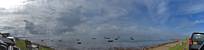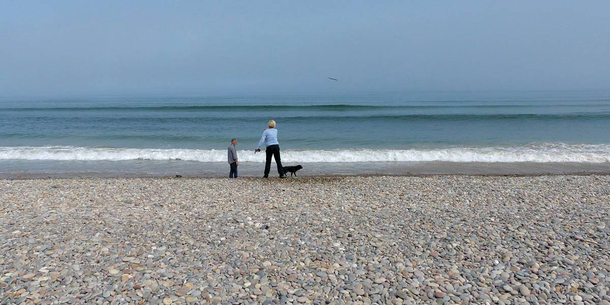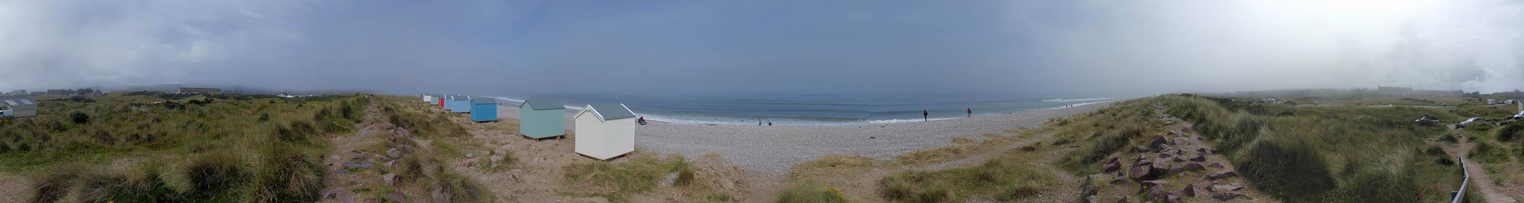 360 degree panorama on the North side of the haar shrouded Findhorn Peninsula. North in Centre. | Dog walkers enjoying the beach. | Breaking waves. |