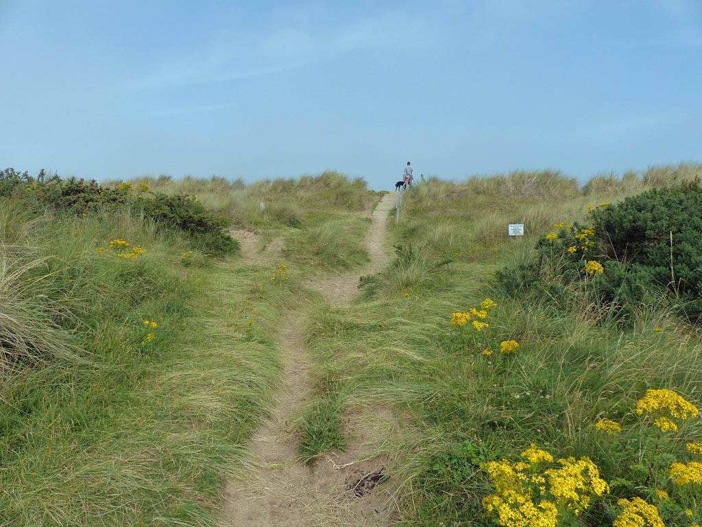 The pretty blue form of the Female Common Blue. | The stairs up onto the headland. | This ragwort plant had many Six Spot Burnet moths on it. | Small Tortoiseshell on another Ragwort plant. | A more regular Female Common Blue. | From the headland the jeti looked mysterious in the haar mist. |