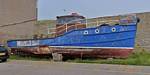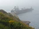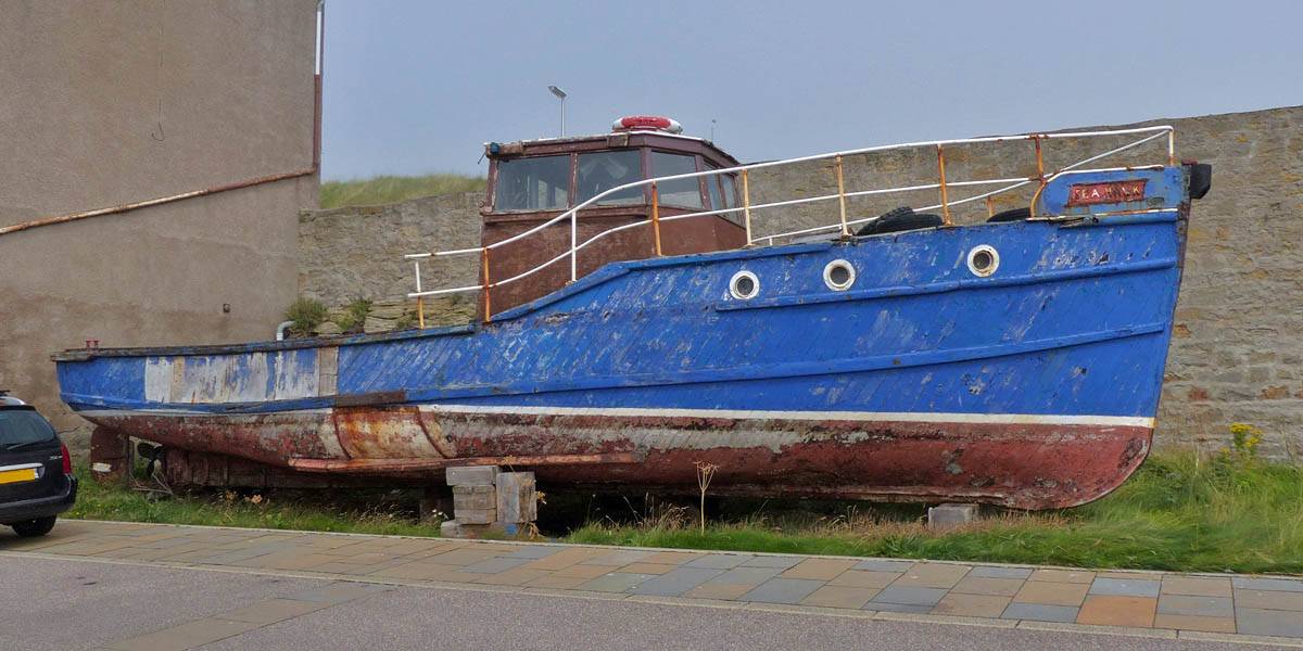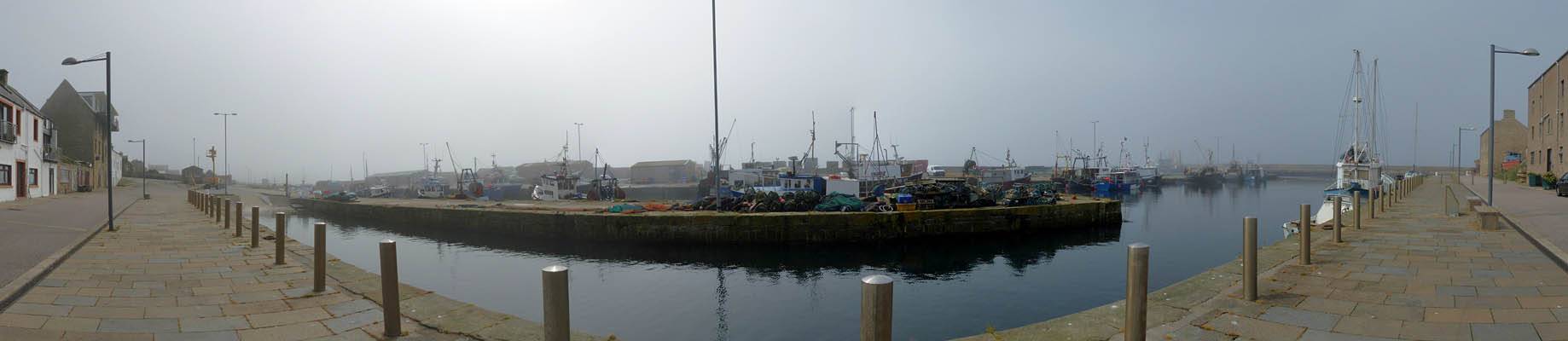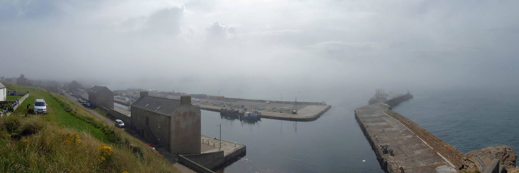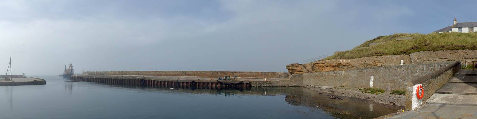 A misty Burghead harbour. | Apparently this rust bucket boat is for sale. | The jeti at the end of the harbour, and the headland where the butterflies are. | Two shots of a pied wagtail. |