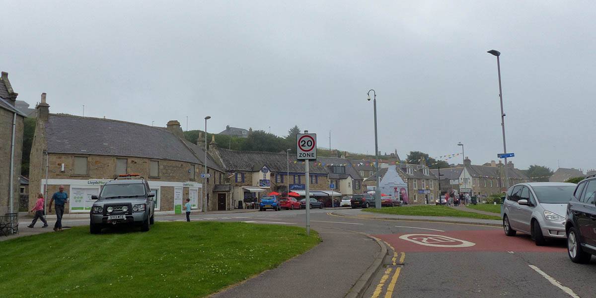 Driving through Lossiemouth town centre. | Looking Northeastwards out at the sand dunes across the Lossie Estuary. | Lossiemouth from the Southeast. | Driving back West along the A96 into the path of a heavy shower. |