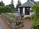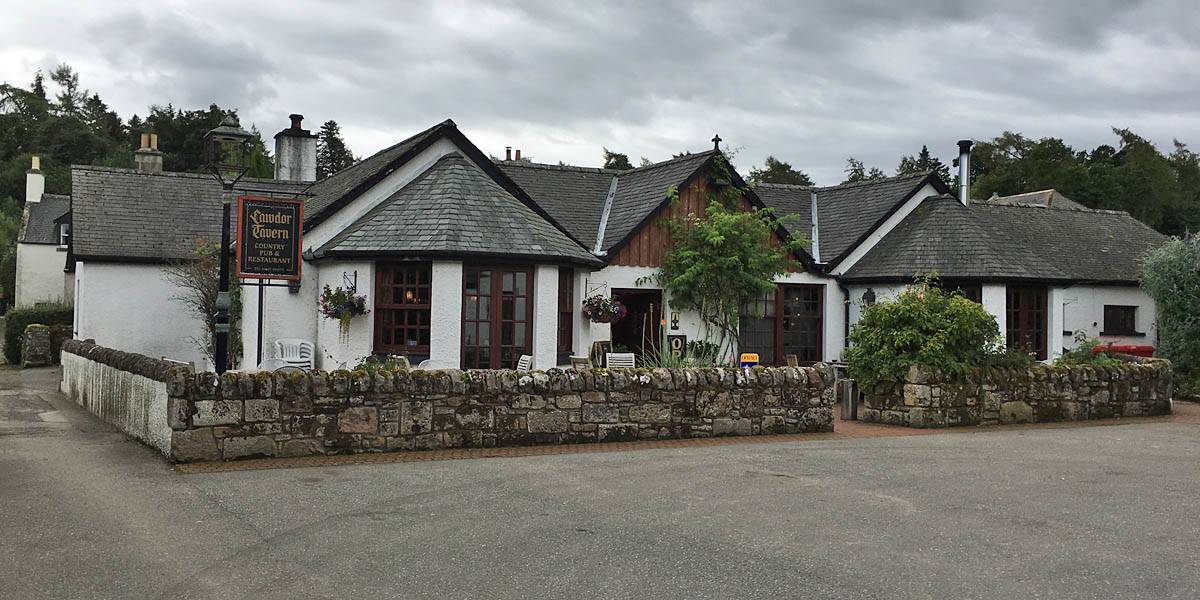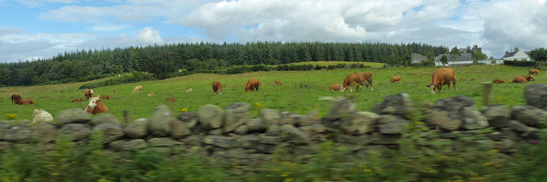Nice sky aloft as we depart for Cawdor. | Driving through pleasant woods and past a cow field. | The Cawdor Tavern. |