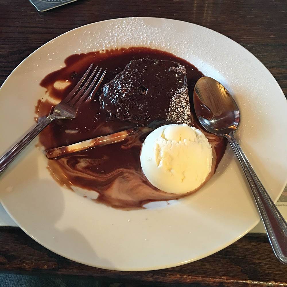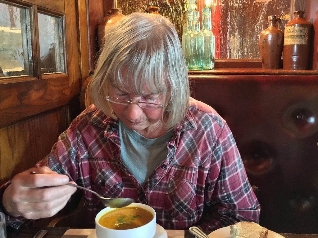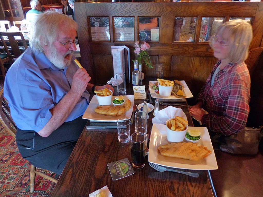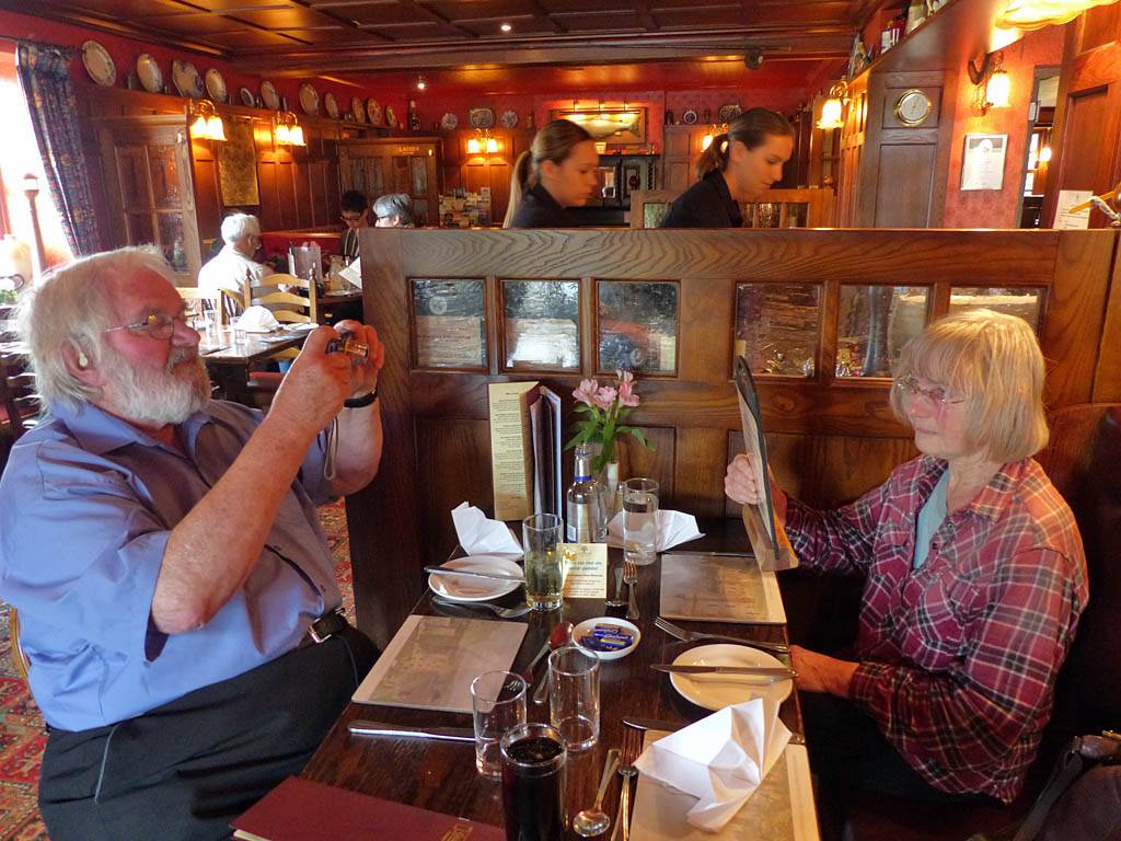 Back inside I processed more diary captions until we left for the pub at 11:40AM. Jack drove us in the Skoda to the Cawdor Tavern for our planned birthday lunch, arriving at 12:10PM. It was a nice pretty place with old style decor and lots of ornaments on the walls. While waiting for the food Jack was experimenting with the cameras including my iPhone camera. We had some complimentary home made wholemeal bread first. Then Stella had a starter of carrot and coriander soup. For mains Jack and I both had haddock and chips while Stella had the fish special which was plaice on the bone. Then Jack and Stella had coffees for afters while I couldn't resist a chocolate brownie which was delicious. I then paid up (I had agreed to and was happy to pay for this meal as a thank you for them letting me stay with them and for Stella's birthday) and we left at 2:15PM.