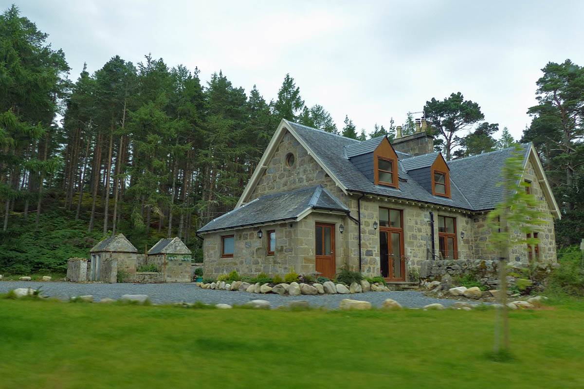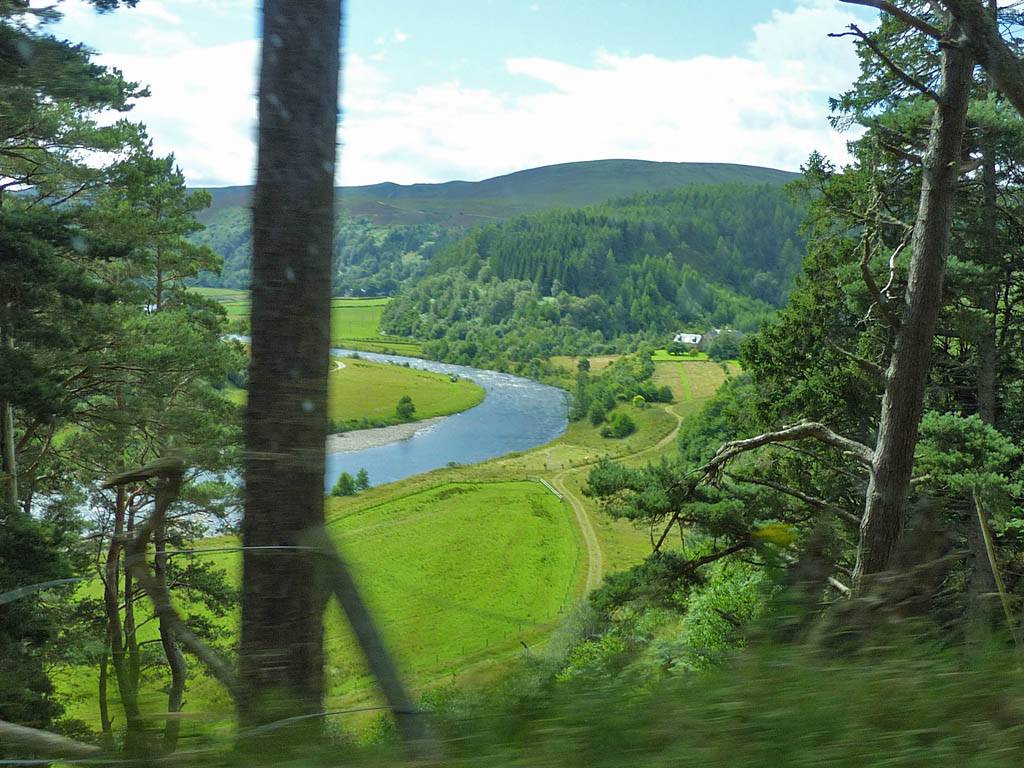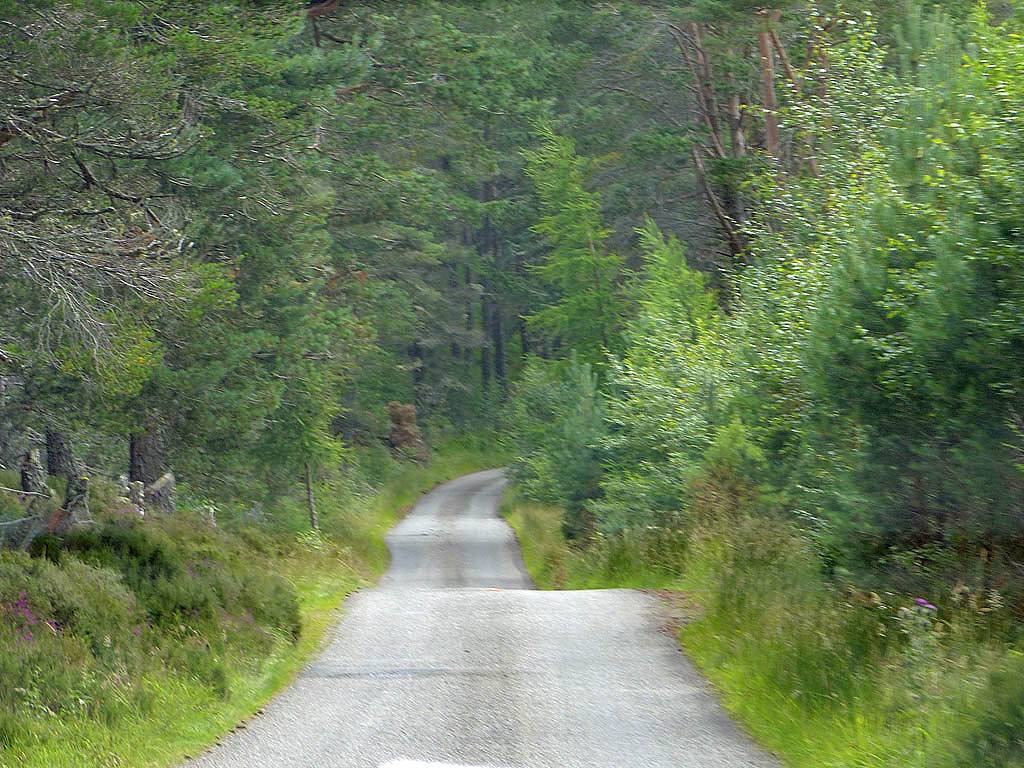 Instead of driving straight back we went for a quick foray up into the hills. We headed Southeast out of Cawdor then South-Southwest into the hills. Up here it was very wild and rugged, and beautiful in the nice weather. I tried to take pictures but in the back seat of the Skoda it was rather difficult. Eventually we dropped down a zig zag stretch of the road into a place called Drynachan Lodge.