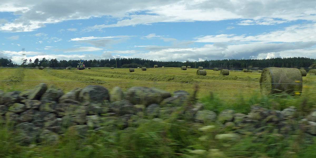 A nice house as we head out of Cawdor. | Heading out past a farmer's field where hay bales are being made. | Driving up onto the wild open moors South of Cawdor. |