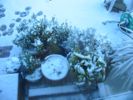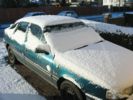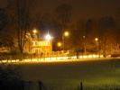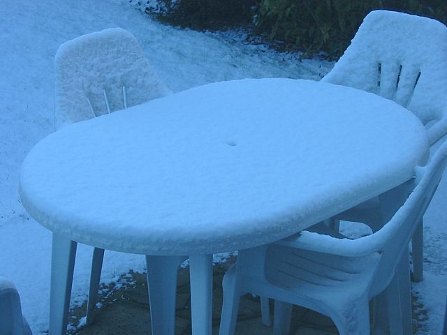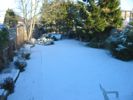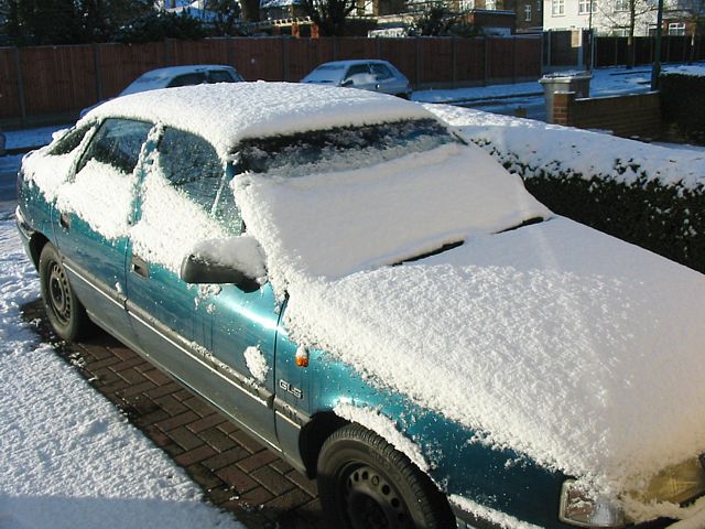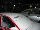 This is what greeted me when I left the office. The bright dots are large snowflakes reflecting the flash. | Just after midnight this 15 second exposure reveals the view northwards from my window as an eerie orange-white landscape under the streetlights. | The view out of the back door the morning after. | My car was clear, but the Cavalier wasn't! |