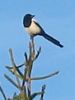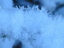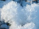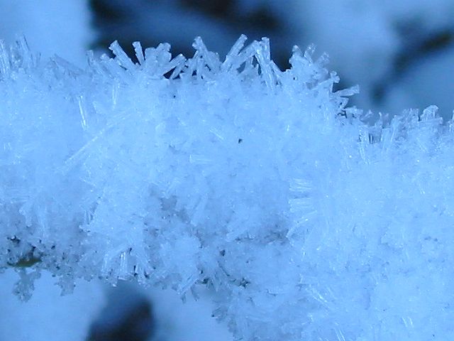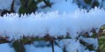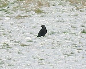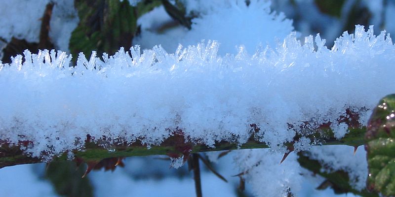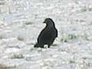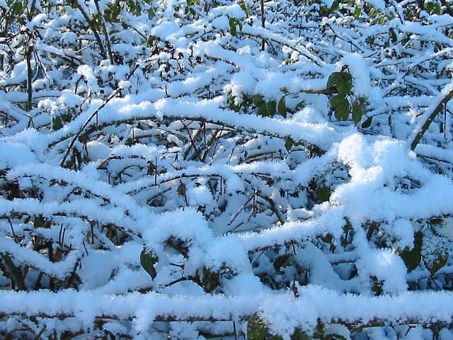 A row of brambles. | A zoom-in on the brambles reveals hoar frost on the snow. | Crow | Magpie |