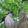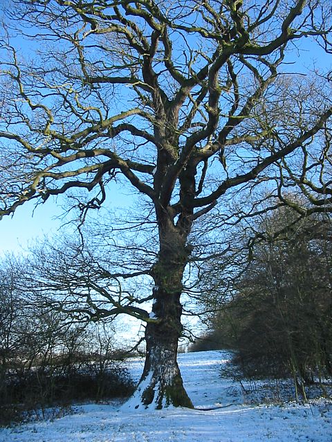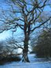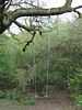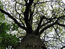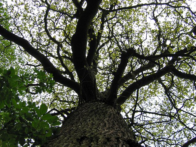 Another small clearing on my way down the hill. | The path leading down the hill and out of the woods. | Looking up the trunk of a huge ancient oak tree guarding one entrance to the woods. |