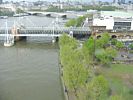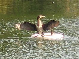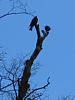 The Potomac pond outside the office seen from the back. | Granted the trees are older and bigger here than at Stockley. | Someone flying a kite in the strong breeze as I walked north along the western edge of the park. Crow in foreground of 2nd pic. | One of many resident crows. | Conifer tree silhouetted against the sky. |