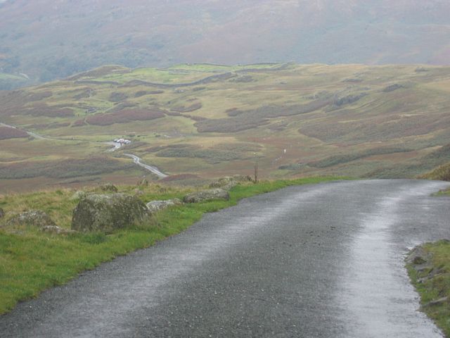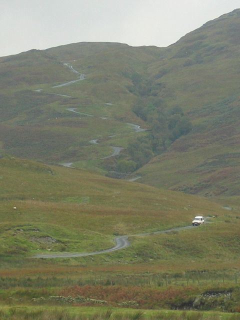 Looking Westwards from the top of Wrynrose pass. Hardknott pass is just visible to top right of 2nd picture. | Another mountain stream between the passes. | Looking up Hardknott pass from the East. It took 1st and 2nd gears to haul that Vauxhall Corsa of mine up there! | Made it to the top! Looking back. |