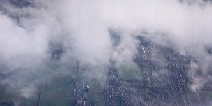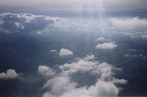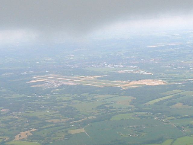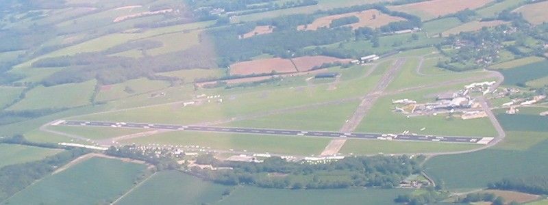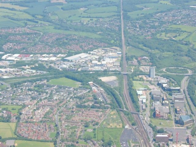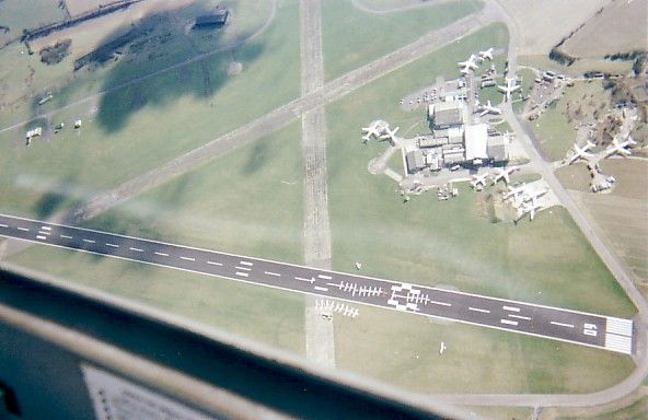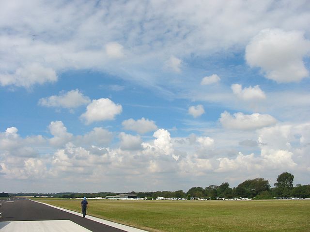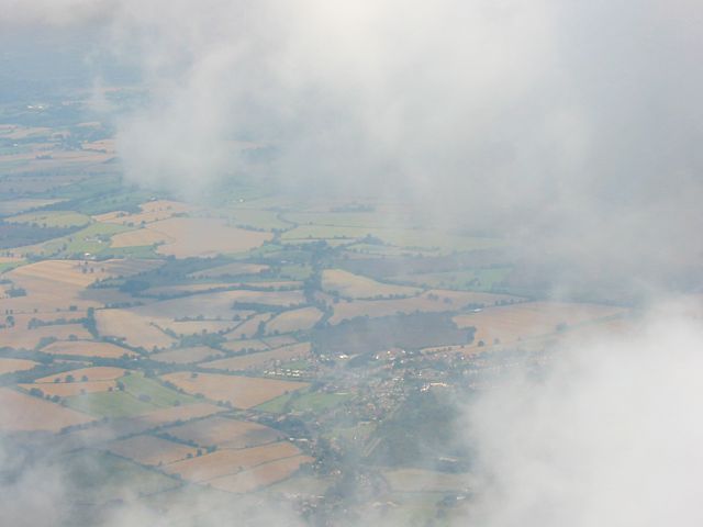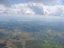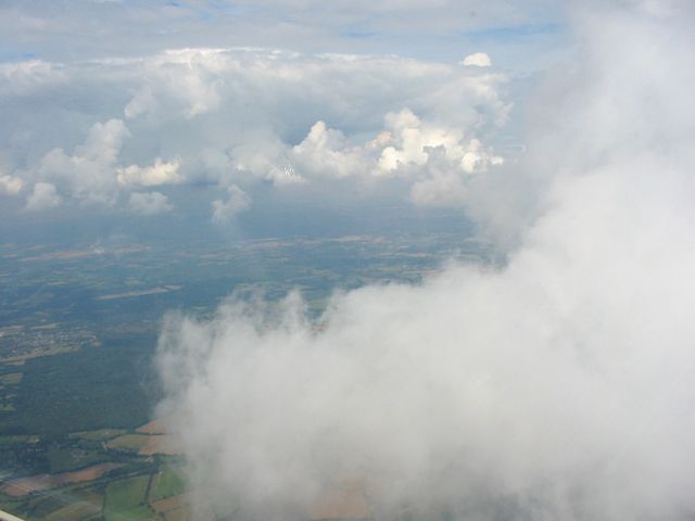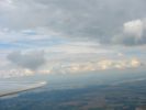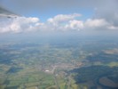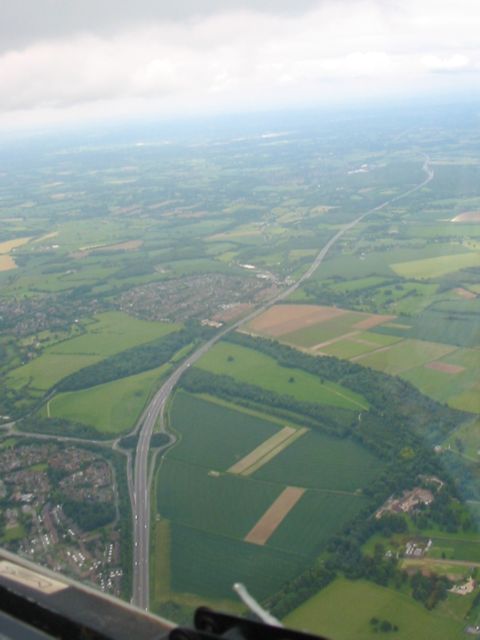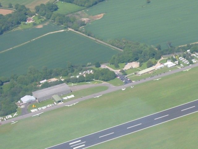 An aerial view of the launch point from overhead loking south. Behind the launch point is the jet maintenance plant. | Picture taken from cloudbase (3000 feet) of the next cloud to the north. | An aerial view of the airfield from the south. The main hangar, entrance and clubhouse are visible in the center. Mind the cockpit reflections... | Basingstoke from the South. In front of Basingstoke is the M3 (and Junction 6 to the right). | Gliders soaring below me. | Sun beams lighting up the ground just south west of the airfield. Taken from north of the airfield. |