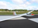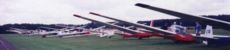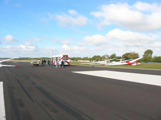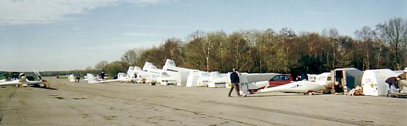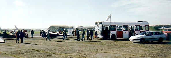 Launch Point - Note the bus that has replaced the old launch van. | This is the glider (Discus-B model) I flew on 2nd March 2002. | A bank of trailers to the west of the clubhouse. | A large jet just landed. In the foreground is a Grob102. Behind that is one of the aerotow tugs. | An aerial view of the airfield from the south west. | Gliders soaring below me. (See the second glider in the bottom left corner way below me.) |