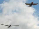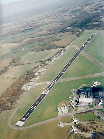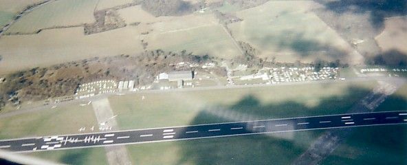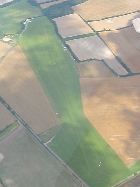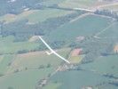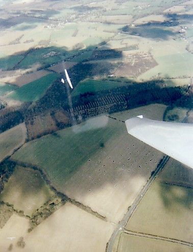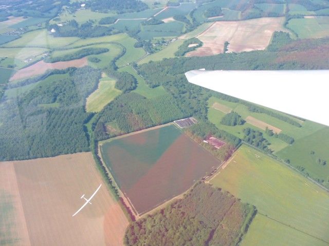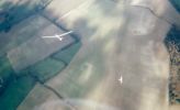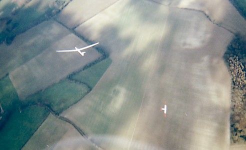 View of the hangar and the clubhouse from the south. The black 'road' is the runway. I can see my car down there... | Lasham airfield from the north. | Me soaring in thermals with another glider below me. Both near the airfield. |