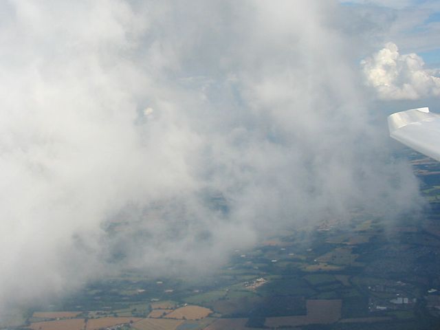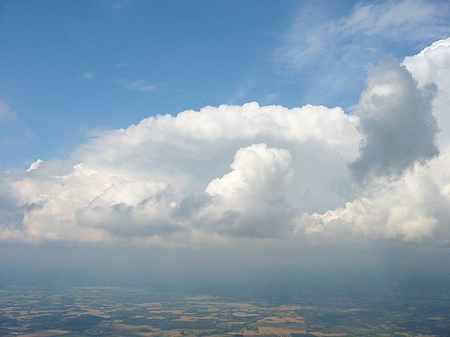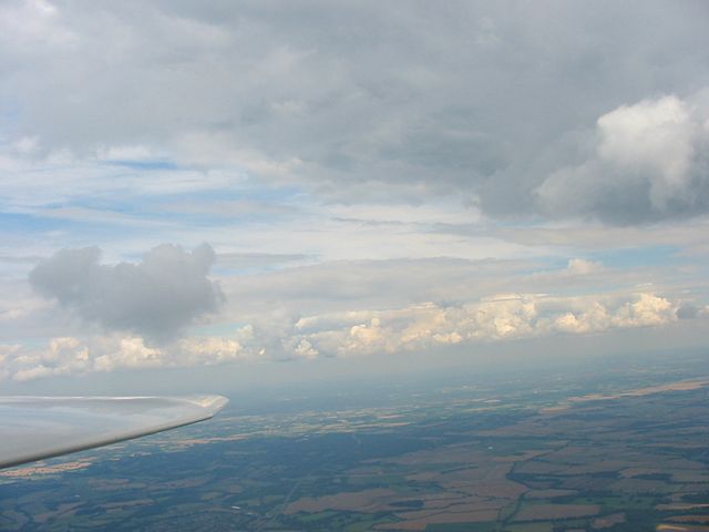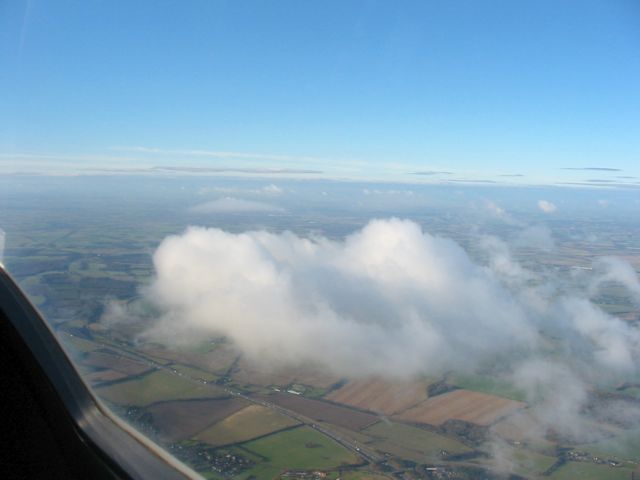 They were everywhere. I was about 1000-1500' above them at the time. Lasham airfield is near the right edge. | This cloud near Basingstoke formed a little wave bar on top. Left: When I first spotted it (see tiny bar to left). Right: It grew bigger and bigger as I descended. | Same cloud as I descended past it, dipping a wing in to get 0-0.5Kts lift. No lift under it. |