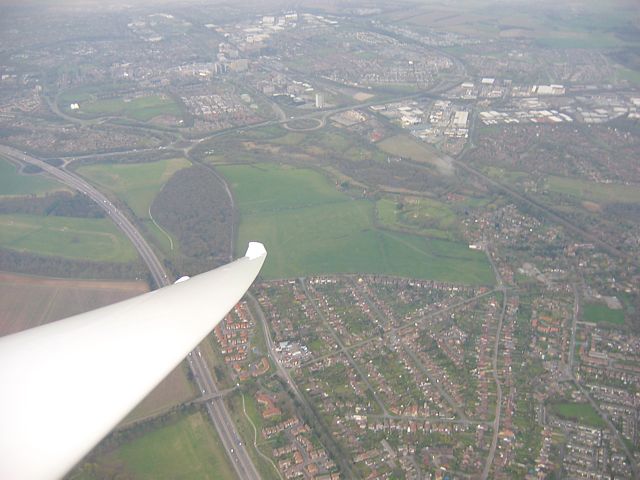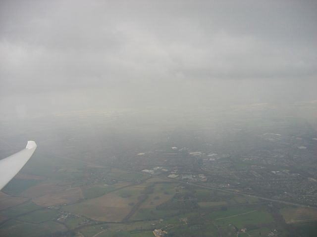 Someone towing out in the morning. Rather moist showery airmass starting to bubble. | The launch point. Winch queue to left, launch point bus, fire truck and parked private glider in middle, aerotow queue to right. | Soaring over Basingstoke again. Looking down the port wing at about 30 degrees. | Sun on the ground was at a premium today. (Lasham to right in sun). | Low throngs of cloud to the north of me obscuring the M3. | Low lump of cloud trying to obscure the airfield to the south. |
