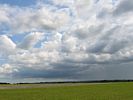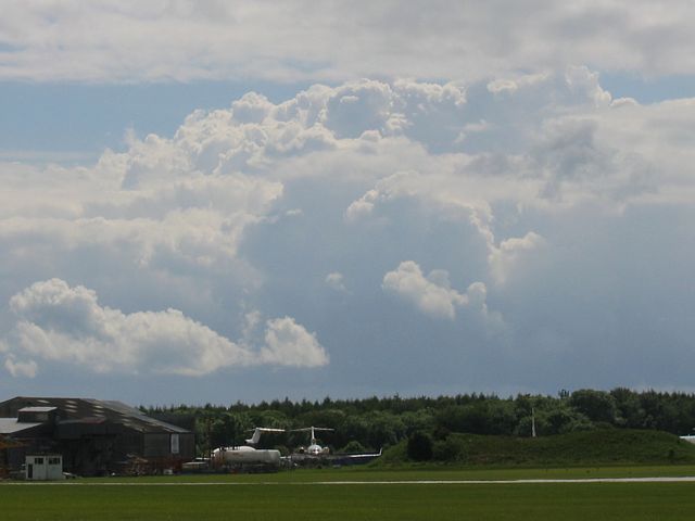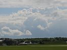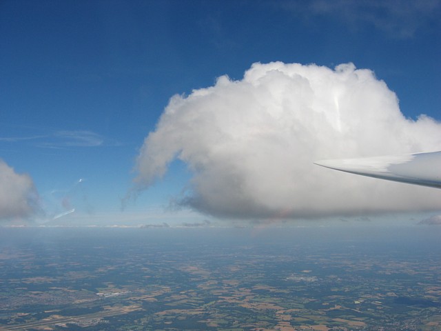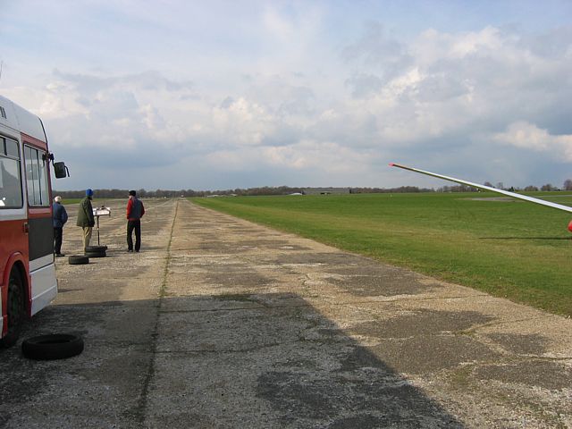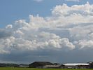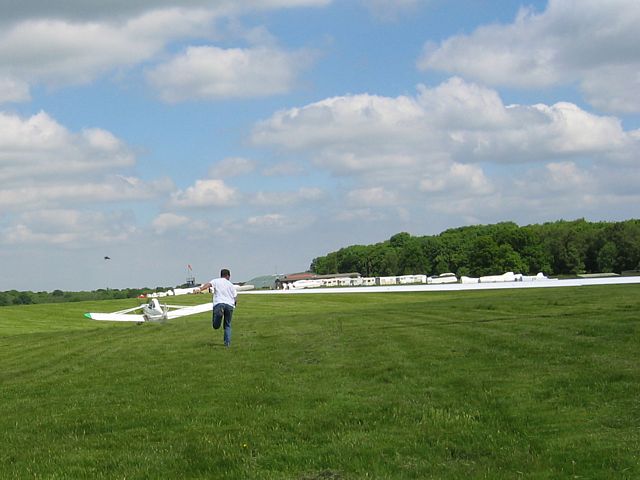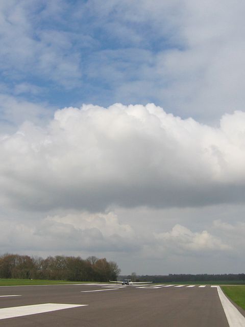 A glorious arty pic of a cumulus cloud. The cloud above me stopped the sun from dazzling the camera. | Spreadout made conditions slightly tricky at times. | Back on the ground after a big shower went through. Just before launch we had switched to the short runway (34). This runway is rarely used. Launch point (you can just see the main hangar over the hill in the center of the pic) and training gliders being retrieved. |