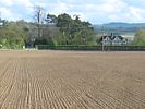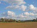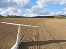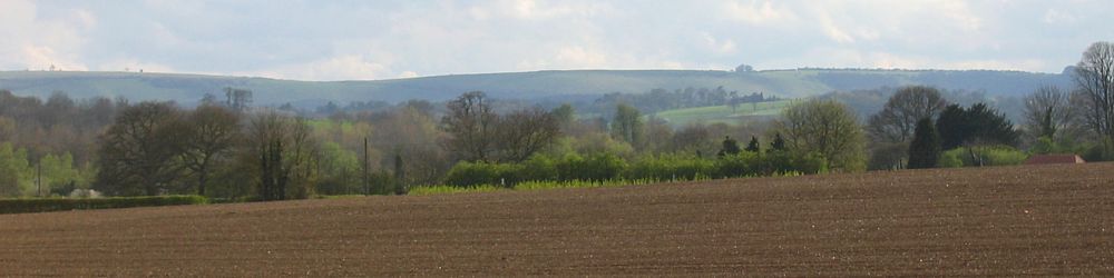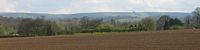 The glider where it came to rest. | The view South. The thumbnail focusses on the entrance gate. | The view North. This field was huge - about 3/4 of a mile long. You can see the small trench the glider ploughed as it landed. | Pictoresque view of hills to the southwest upwind. | Of course, looking back towards Lasham, much better conditions had to be drifting past! |