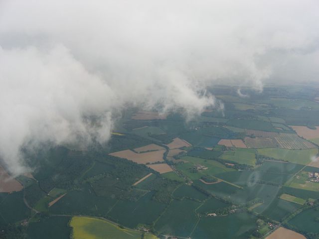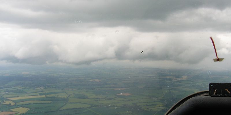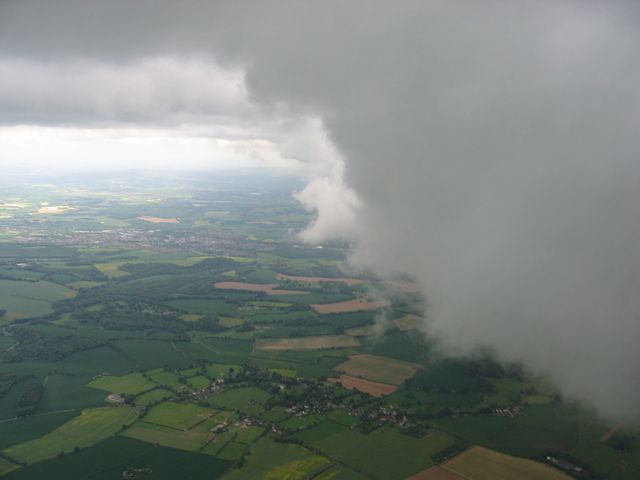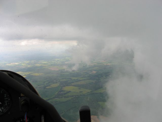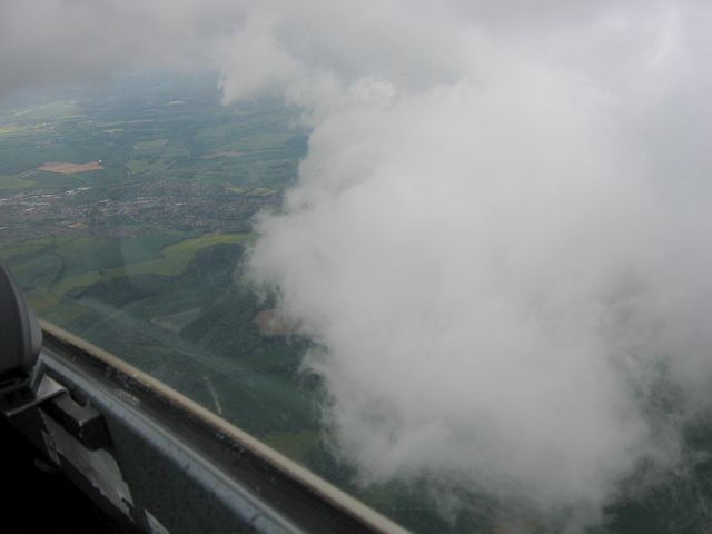 Today was rather showery. I had a relatively short flight at 1 hour 15 minutes, but in that time I saw some amazing cloudscapes. As a shower approached, the cloud around it dropped from 4000 feet above the ground (4600 feet ASL) to about 2500 feet (3100 feet ASL). This made for some good runs alongside the cloud wall, where the lift was strong and seemingly everywhere. Eventually, after losing sight of the airfield as the low cloud came between us, I headed north to Basingstoke where the shower was lighter, and then followed the M3 westwards through the shower, after which I slowly sank back to the ground in light drizzle as I waited for it to clear the airfield.