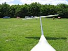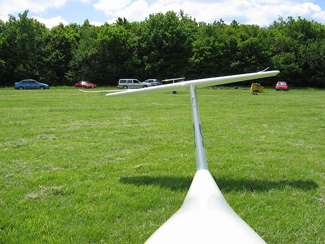 An aerotow launch. You can see the Challock clubhouse and trailers above the tug and glider wing. | The grid (half the gliders launched). | The winch launch point to my left and west. The blue van just towed the winch cables out. | Looking backwards. I took this pic to see what was behind me. I believe the glider behind my tail is the Ventus 2 with the tail number '666' (and I'm not kidding!) | Shaun in Discus B 397 also waiting to be launched. |
