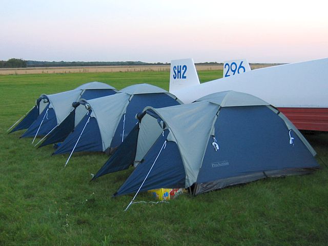We discovered 3 of our tents were identical! Oops... :o) Mine's the middle one. | 2 pictures of me finishing on the 4th - pulling up after a fast flyby and turning finals, and then descending with undercarriage down and airbreaks out ready for landing. |
