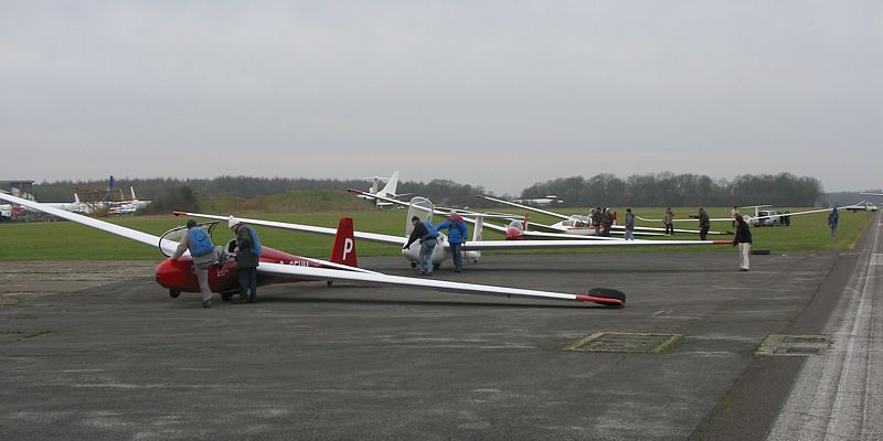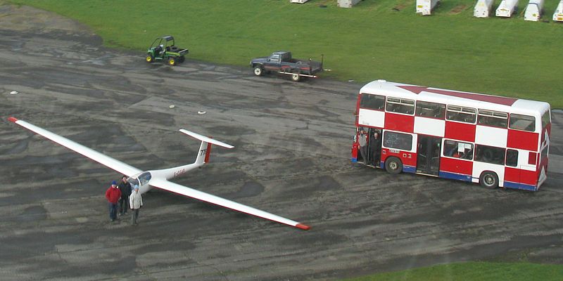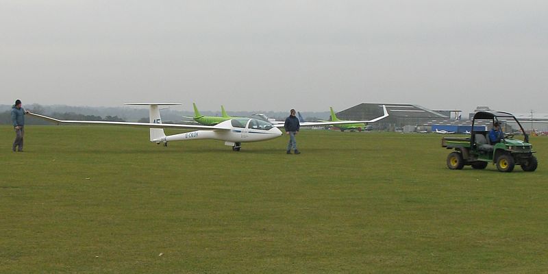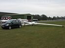 Using the Jazz's towbar for the first time, to take a Discus to the launchpoint. | A large jet sitting on runway 09 after having just landed. | Towing a DG1000 back to the launchpoint after landing. | The winch queue at the launchpoint. |