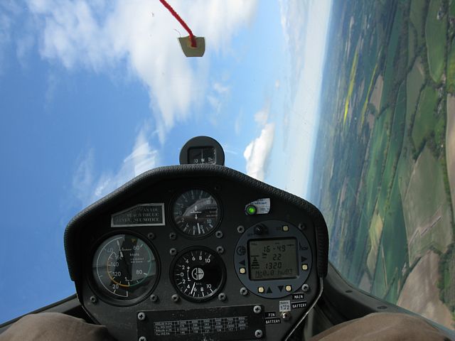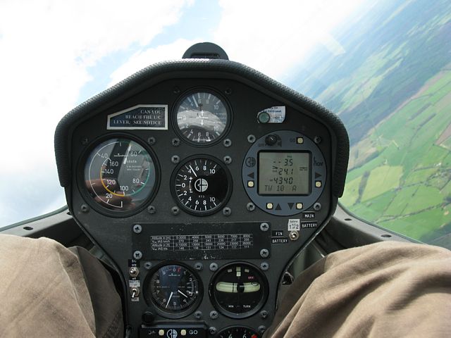 I flew DG1000 776 again today. This time I sat in the back and a fellow junior pilot in the front. We managed to get round a 251km task, Lasham - Birdlip - Bicester - Lasham. There are no pictures between the Birdlip area and the Benson area going home as during that middle part of the flight the cirrostratus top cover thickened up enough to almost kill the thermals. We hung on for ages near Enstone in just 1kt of lift, and eventually got across to better thermals closer to Bicester. We tip toed our way round staying high until, around Benson, the cirrostratus cleared suddenly and the thermals started booming again. It was then that we knew we would finally get home. In the end I was a bit conservative with final glide. The plus side is we had enough energy to push close to VNE during the competition style finish.