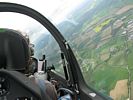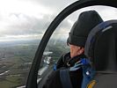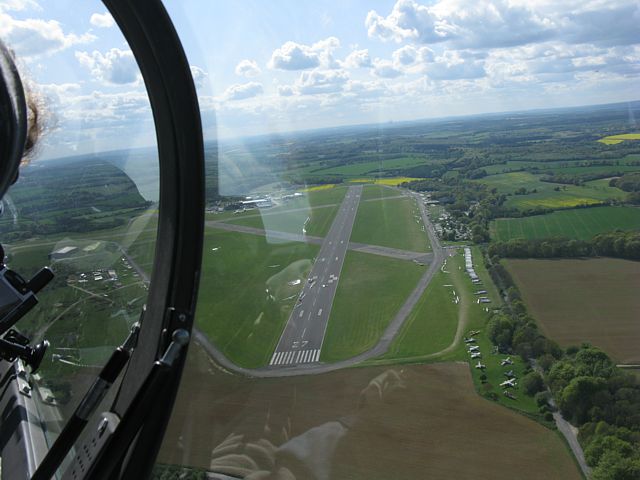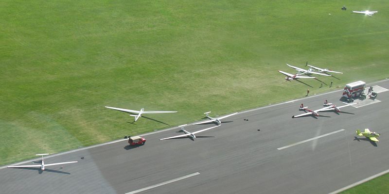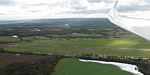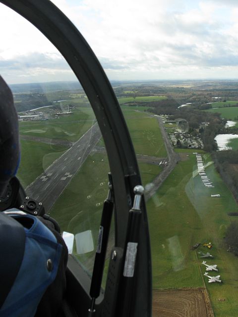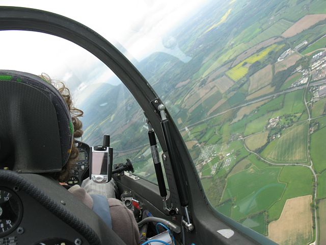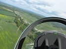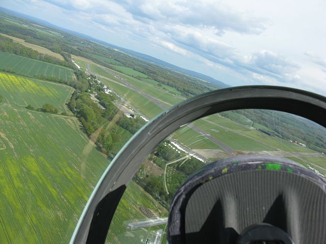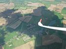 A rare chance for me to take pictures during final glide, approach and landing. This phase of the flight is too critical to risk taking pictures and fly simultaneously. But with Alex in control I am free to take pictures. The final glide finishes with a fast competition style flyby. Then round we go onto final approach to land on runway 27, going long, past the launch point, to land by the hangar. |