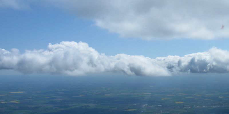 Flying alongside lower cloud. | Looking through a hole in the convergeance towards the South Coast beyond. | Tendrils forming under a Basingstoke cloud as the sea air arrives. | Convergeance over Popham. | Another shot showing how ragged the clouds are. | Flying west alongside the convergeance in very weak lift. |