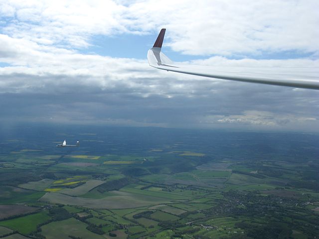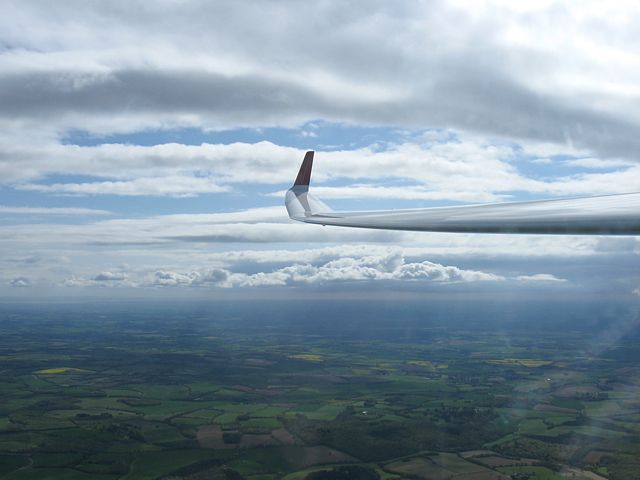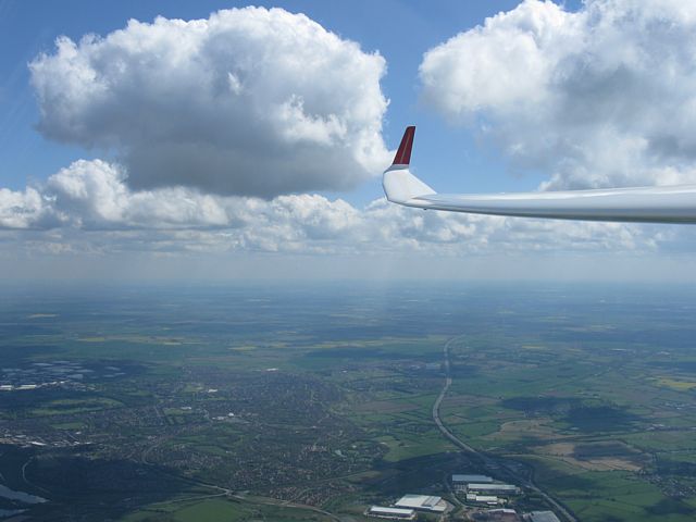 Clouds above Northampton as we pass over the M1. | Pitsford Water from the Southwest. | A closeup of glider 424. | Cruising along track through bootiful skies. Gorgeous clouds with gorgeous thermals under them. | Hollowell (Foreground) and Ravensthorpe reservoirs from the NE, with Guilsborough on the right and Hollowell on the left. | Approaching Market Harborough from the SSW. Clipston at the bottom of the picture. |