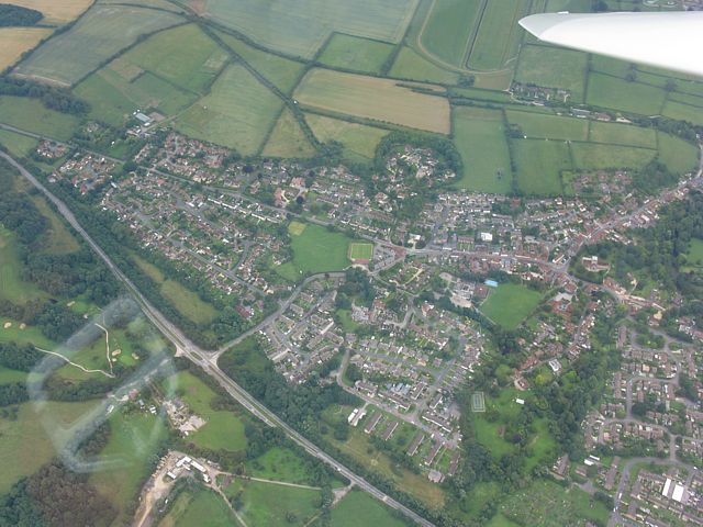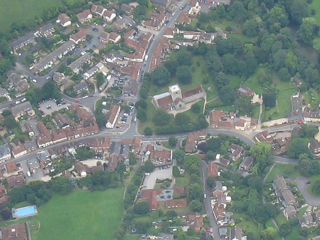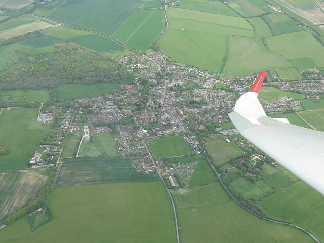 Above cloudbase. | Looking down at the West side of Kingsclere from the East. | Flying past low wisps of cloud. | Looking at Kingsclere from the Northwest and Kingsclere Church from the North. |