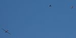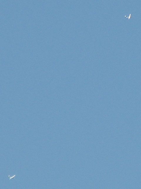 During a walk near Henley On Thames I managed a long range shot of gliders from Booker (to the north) local soaring a wisp-capped thermal. They were probably about 3000 feet up.