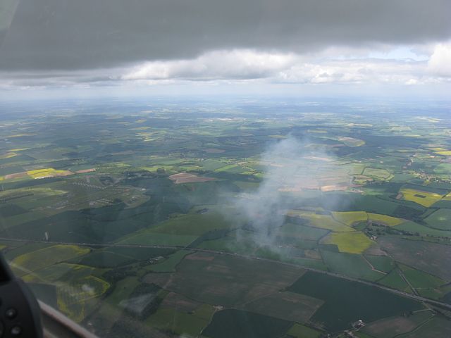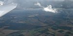 Peeping through a gap in the clouds as I fly around following a cloud climb. | Back at cloudbase, I see a large puff of smoke. It came from the complex to the left of the picture (probably Welford). The road in the foreground is the M4. | Following another cloud climb, I took more pictures from above cloudbase. |