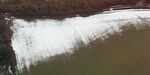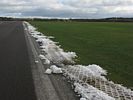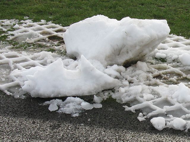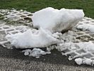 Ice along the edges of the runway. The large block in the first pic I stood on and it took my weight. The other block shows where I stood on it leaving a U shaped gouge. This ice lined the south side of the runway. More was on the north side. A tractor had been running over it to crush it so it melts away. | Looking around just after launch at the patches of snow that have survived in the shadows. |