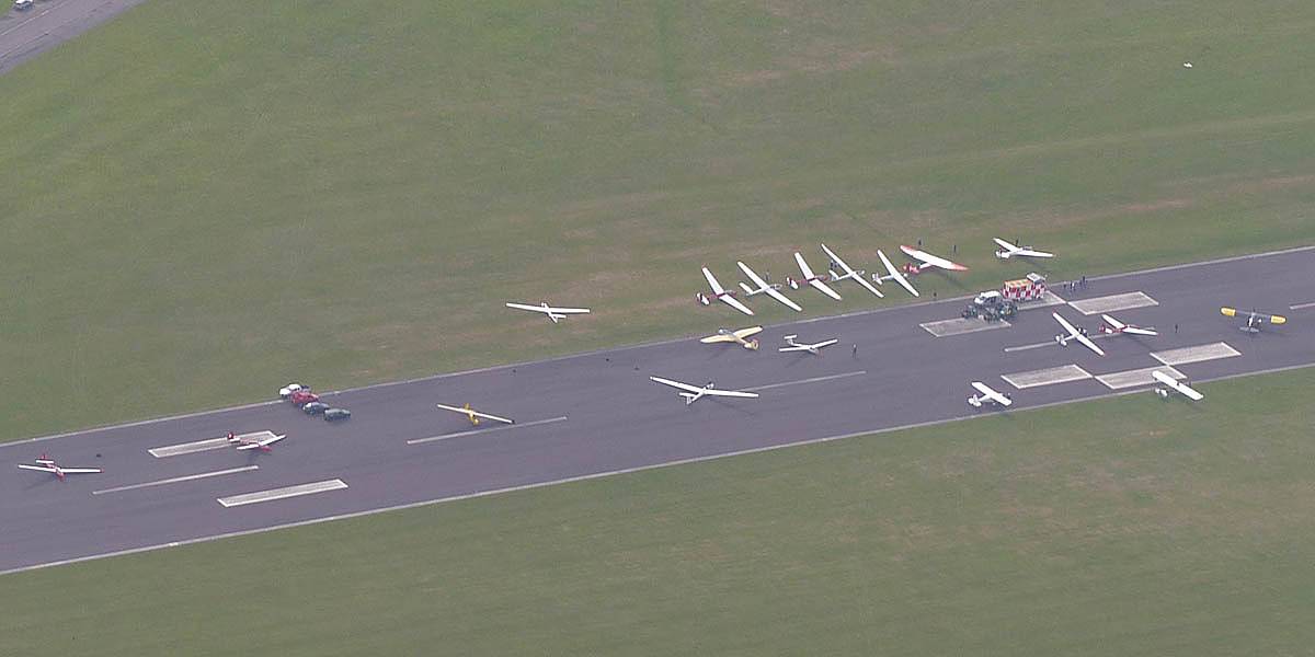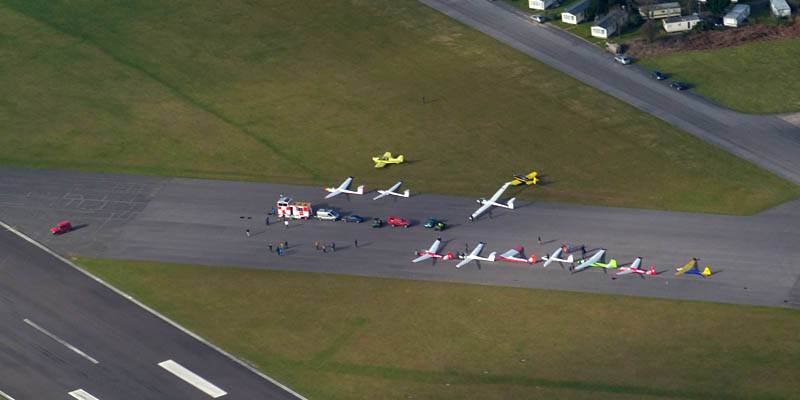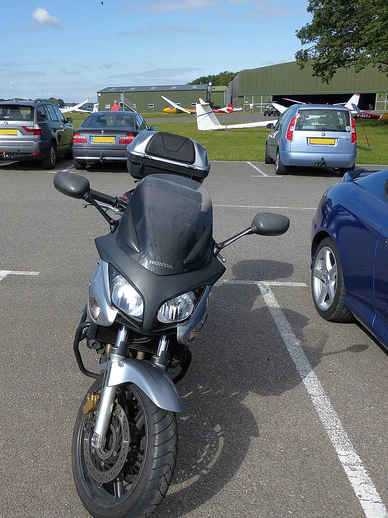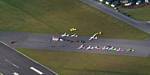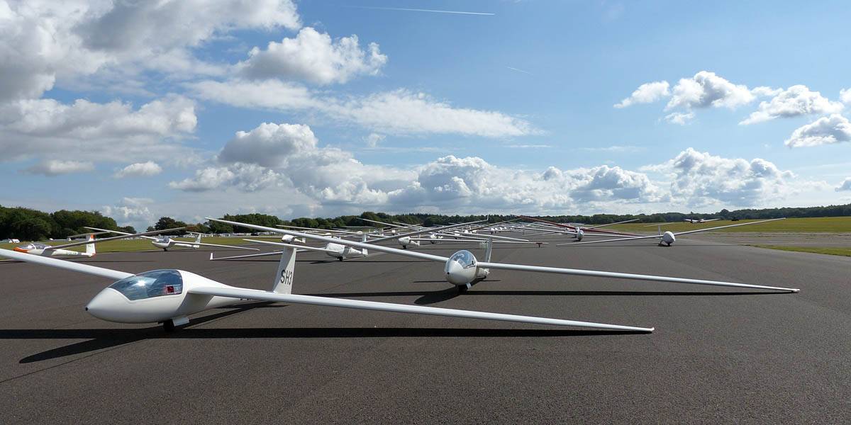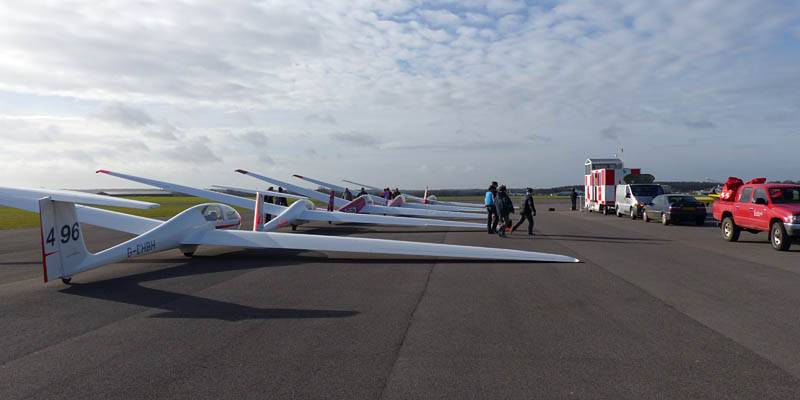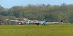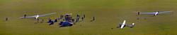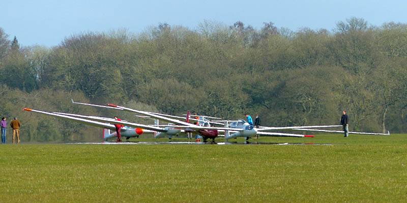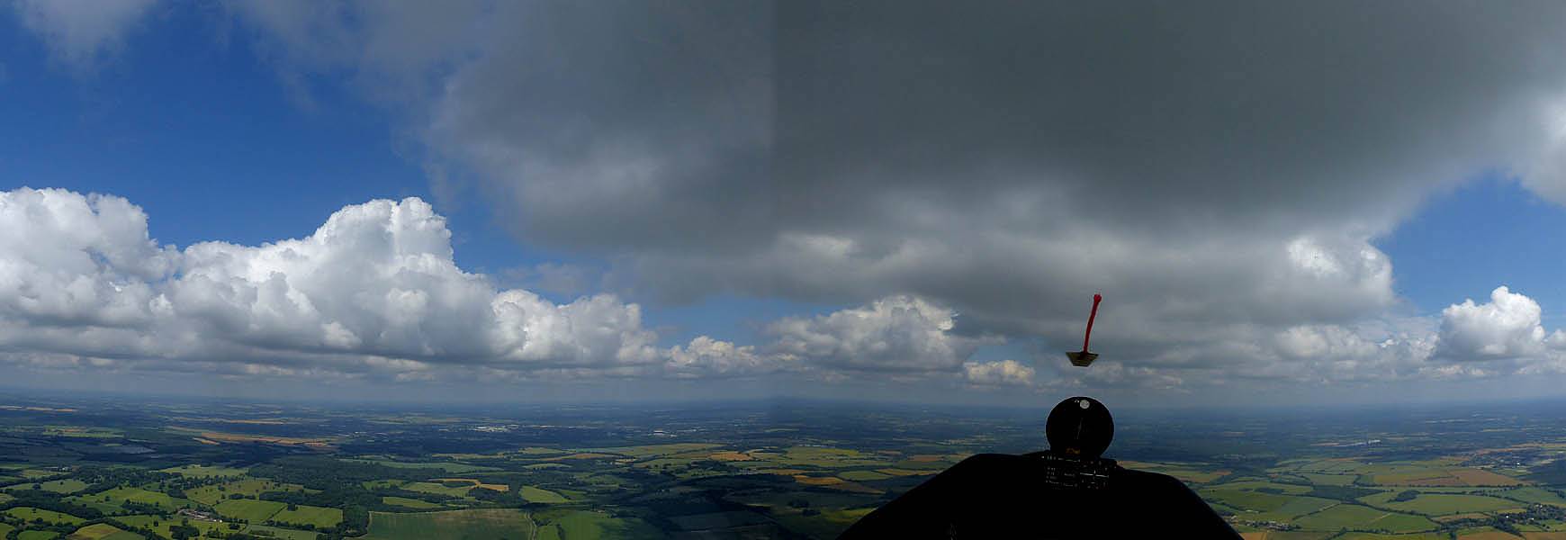 Combining 3 hobbies - gliding, motorbikes and photography. | Big grid. And I'm right near the front of it, in front of the competition gliders. | Hooked on ready to go as we all get chucked into the air at 11AM. | It doesn't take long to reach cloudbase at 3400 feet above Lasham under a big flabby cumulus cloud. | Further aerotow combinations streaming into the air below as 8 tugs do their stuff. |