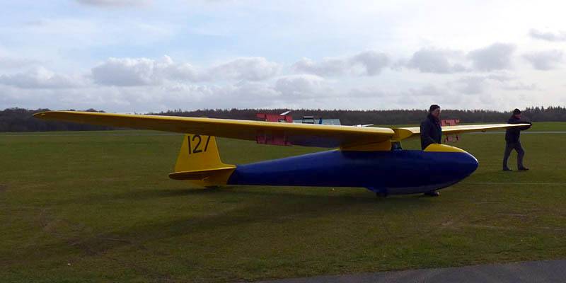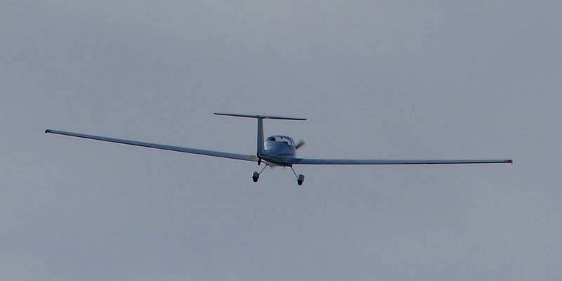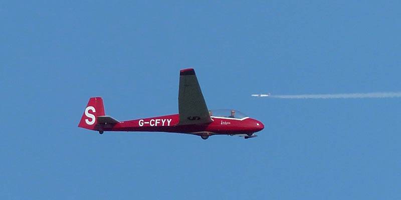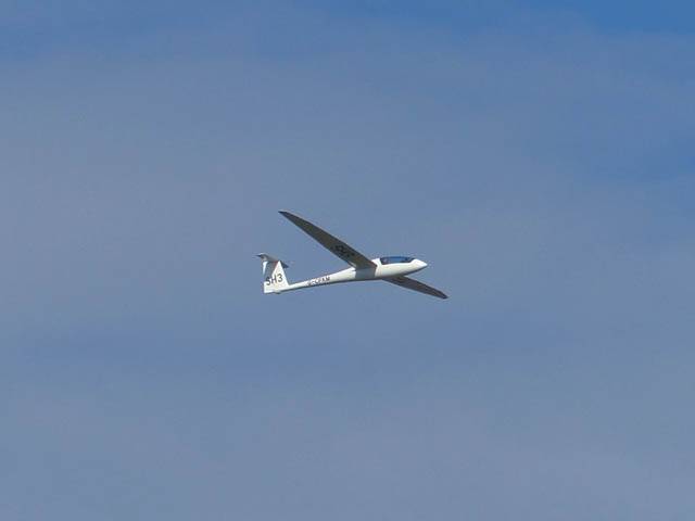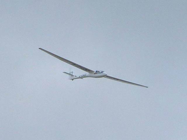 Incoming Superfalke. | The Discus in the air. | Incoming Imperial College Grob103. | The Discus back on the ground waiting for me to fly it. | Swirly cloudscape over the launch point. | Virgae to the North. |