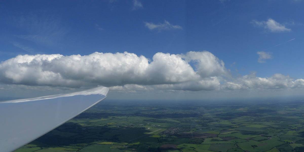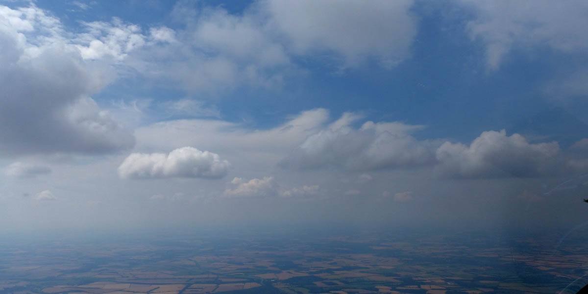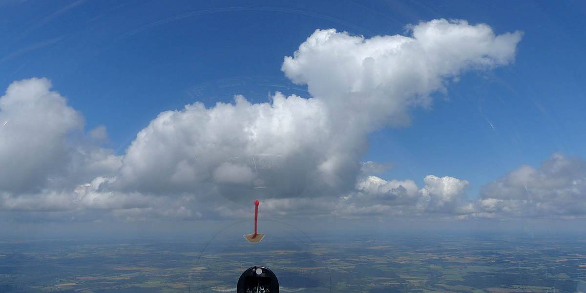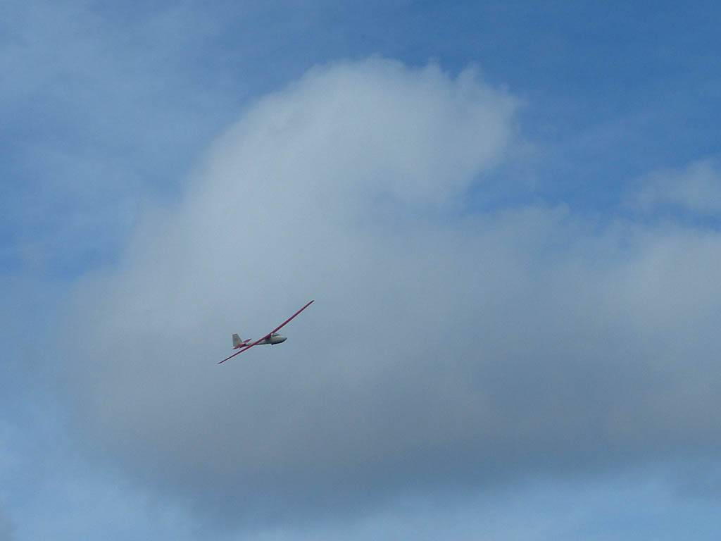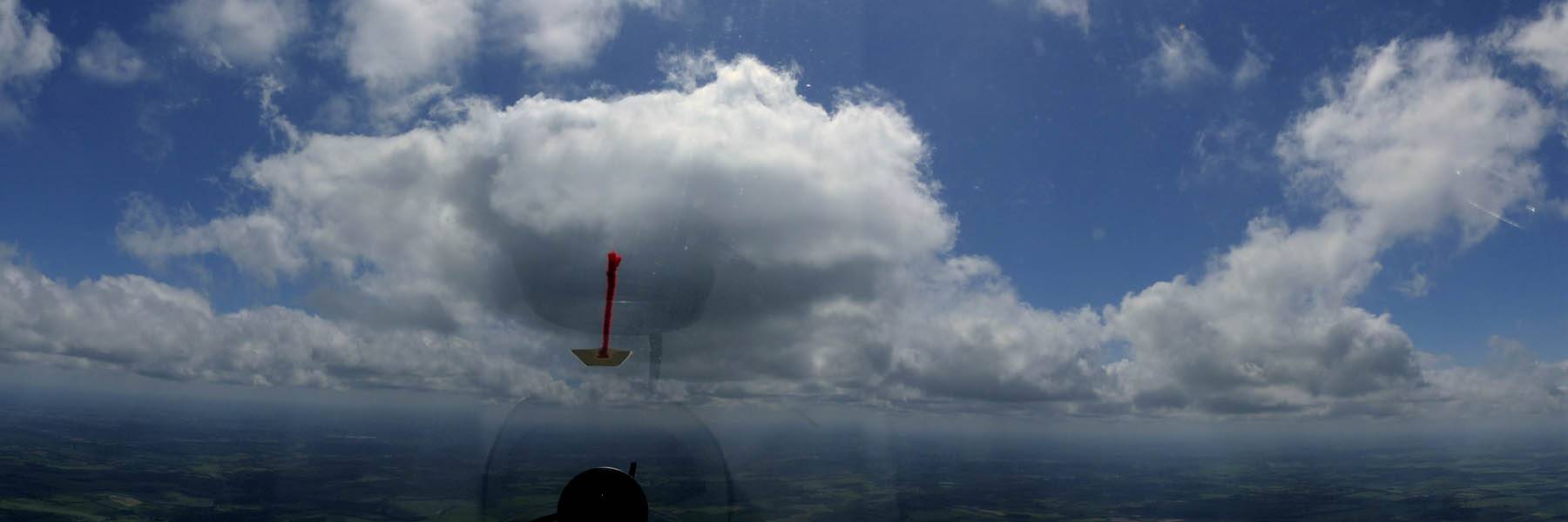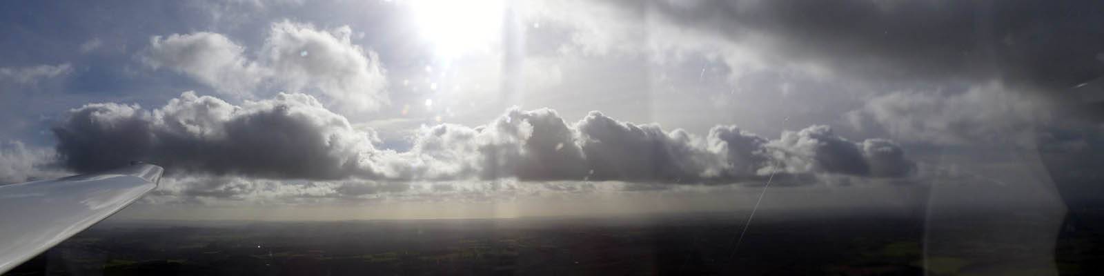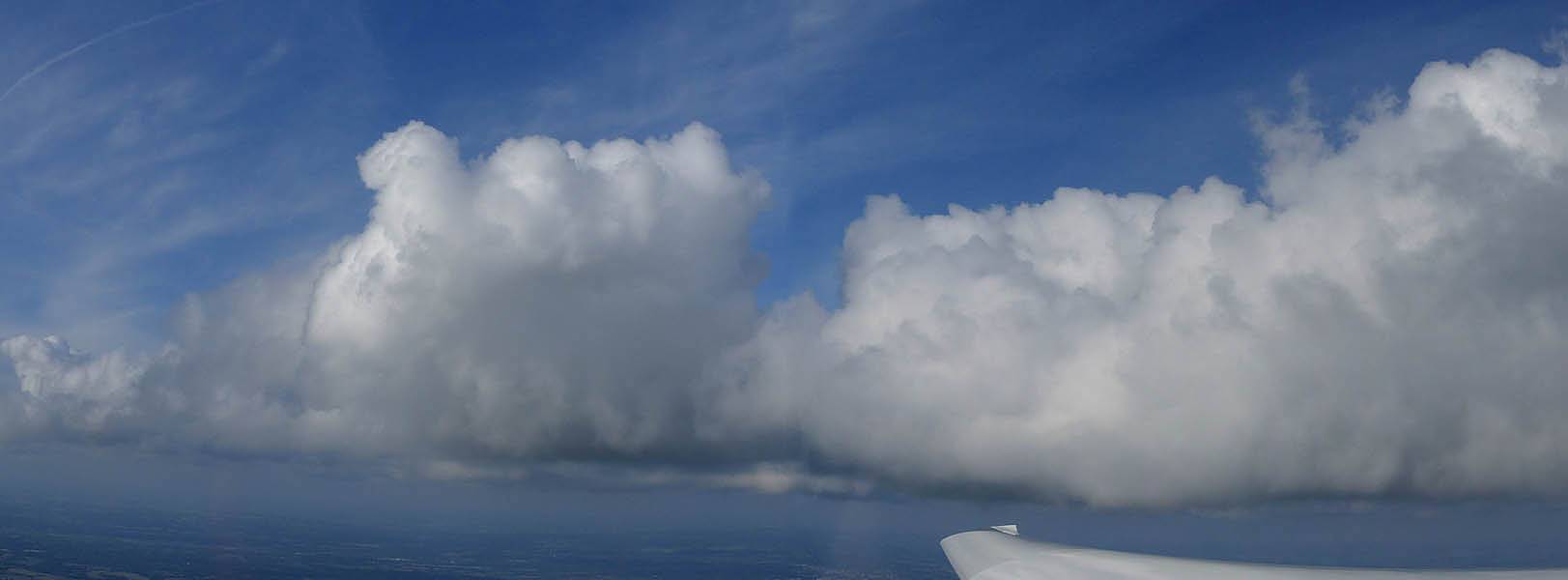 A gap in the top cover approaching from the West. | Cumulus backlit by the sun. | Soaring with a vintage glider. | Heading for a nice cloud. |