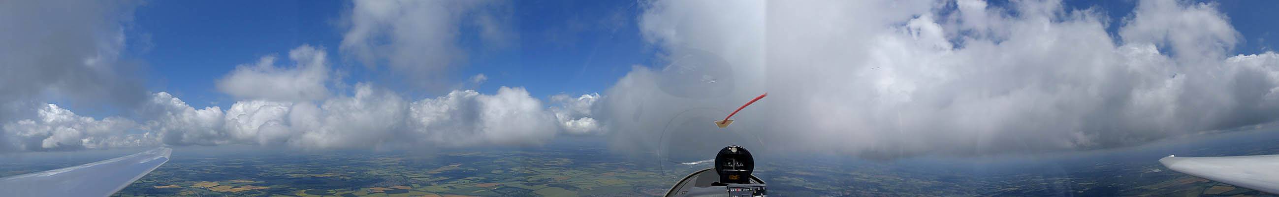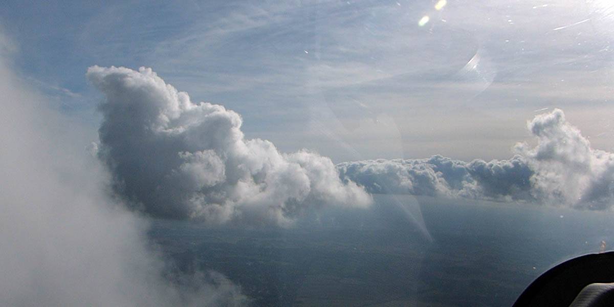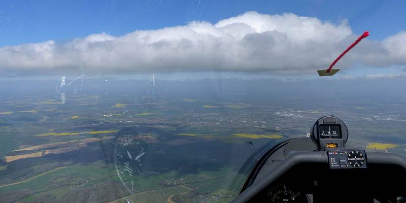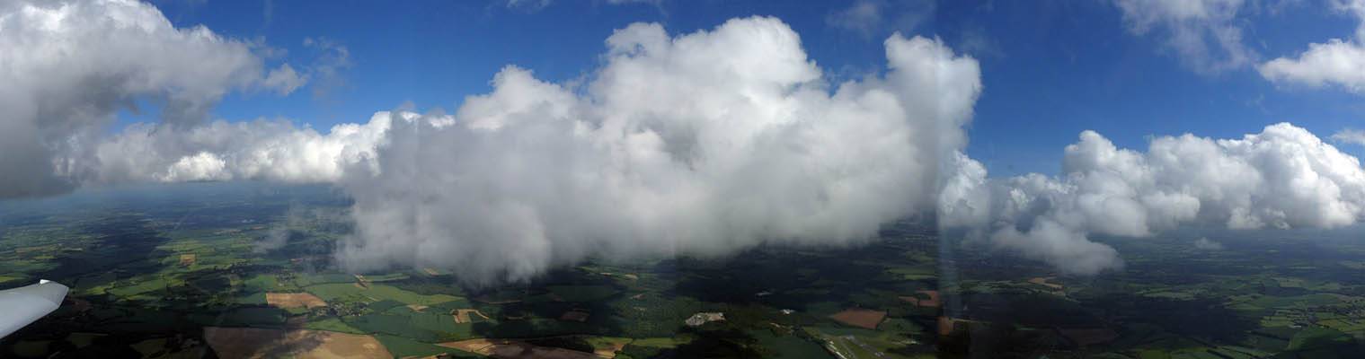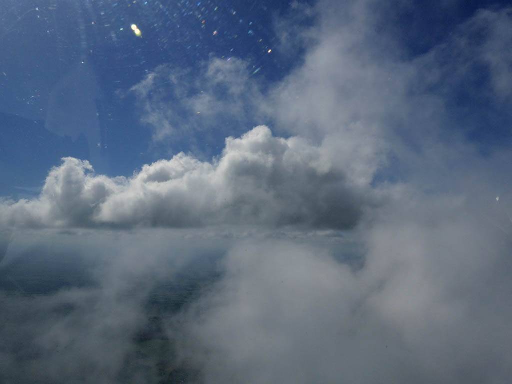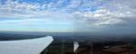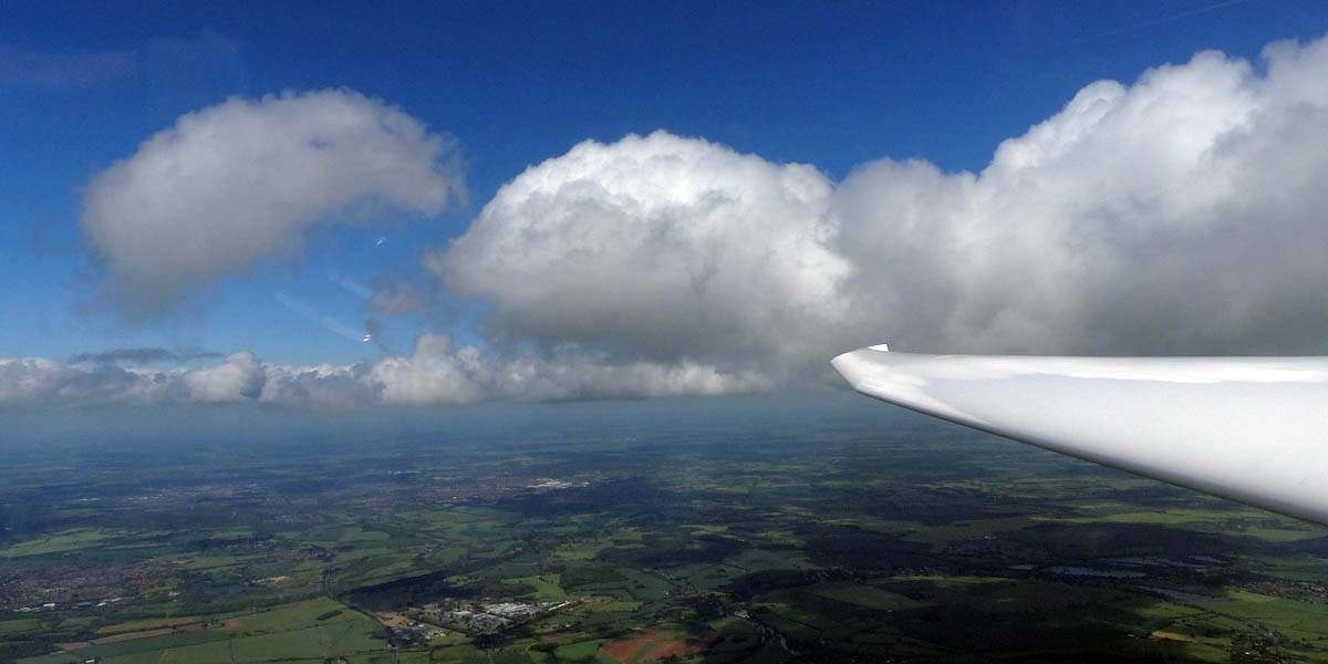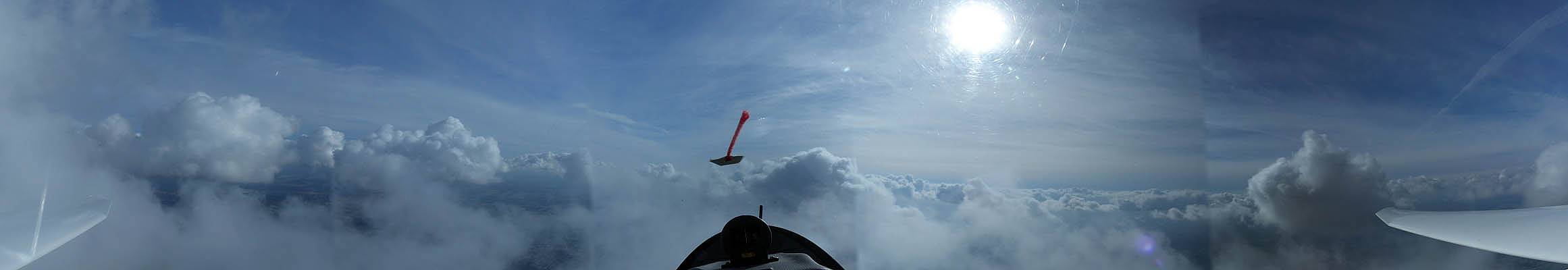 A gap in the top cover approaching from the West. | Cumulus backlit by the sun. | Soaring with a vintage glider. | Heading for a nice cloud. |
