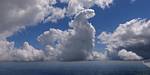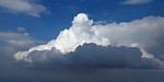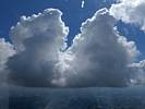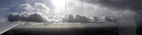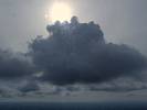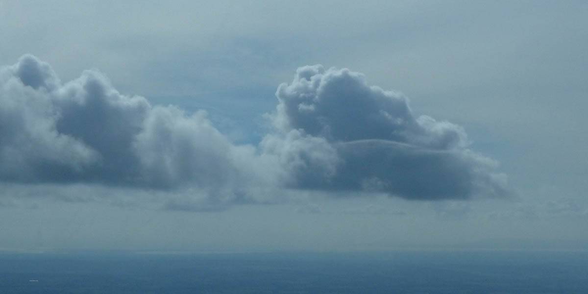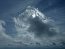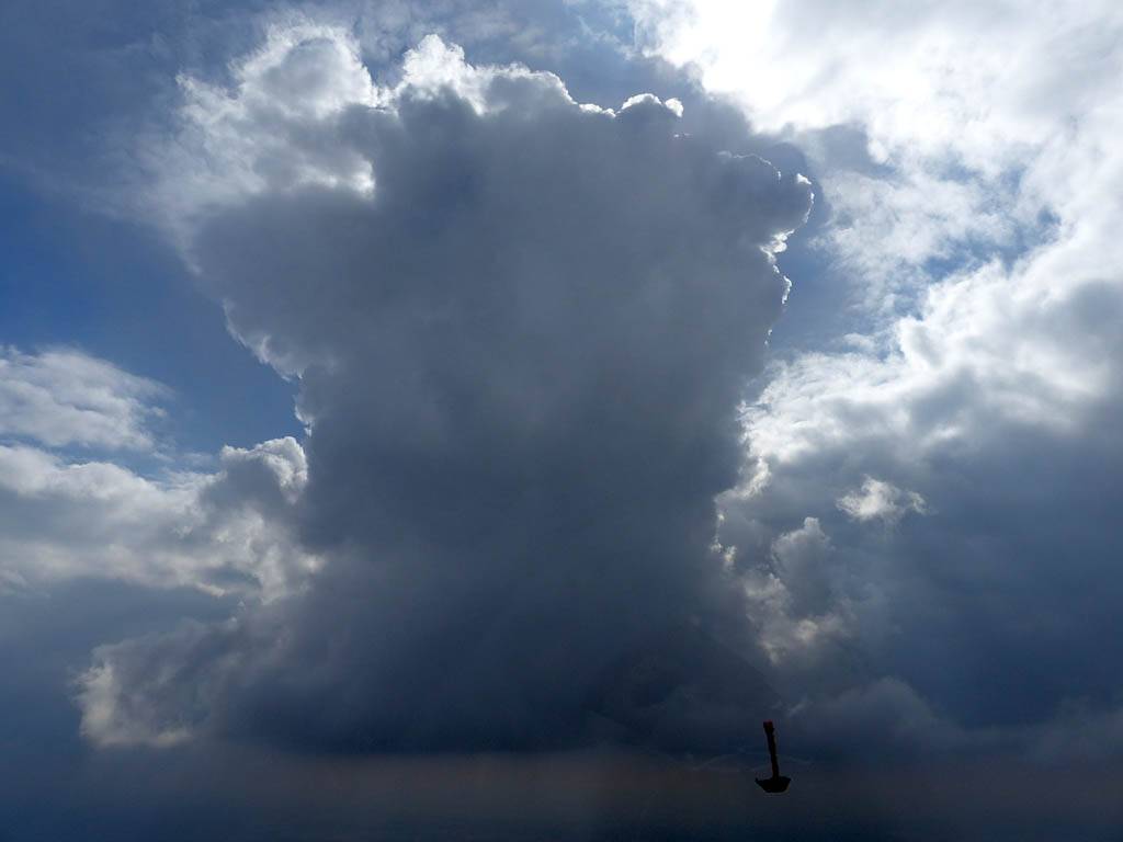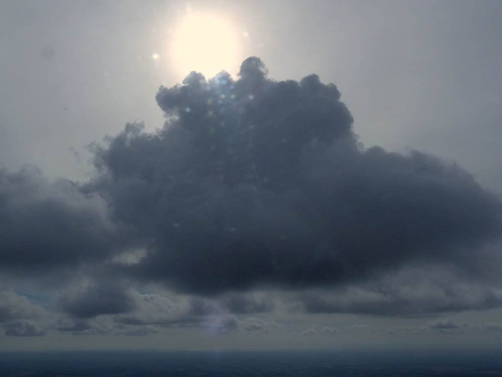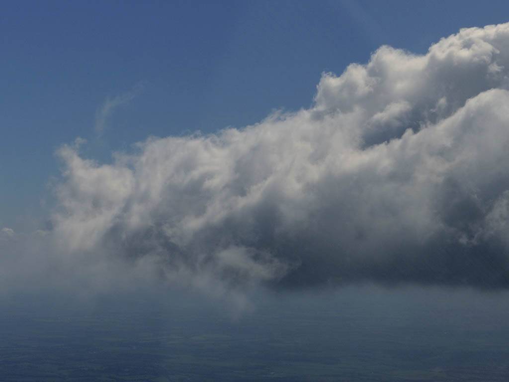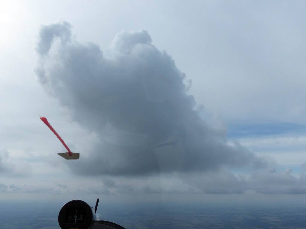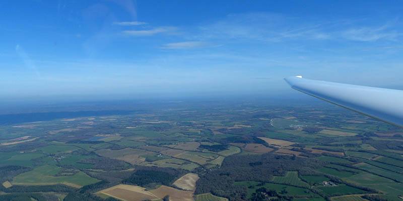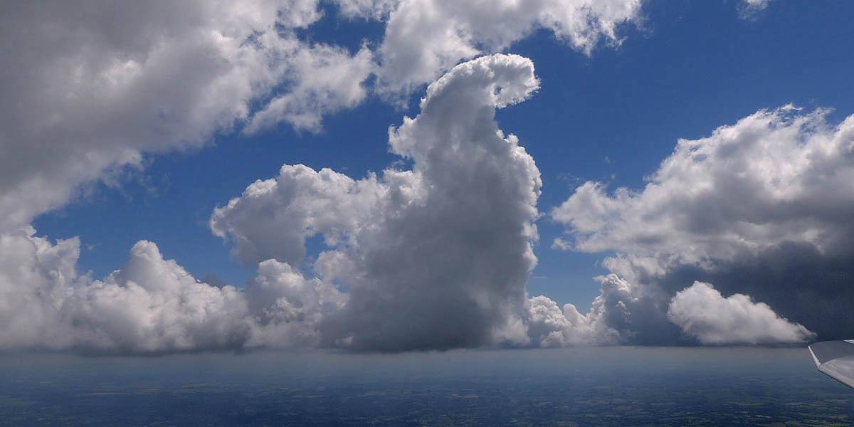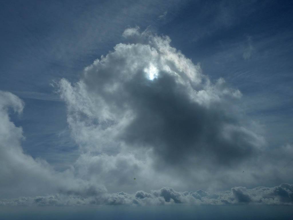 A gap in the top cover approaching from the West. | Cumulus backlit by the sun. | Soaring with a vintage glider. | Heading for a nice cloud. |