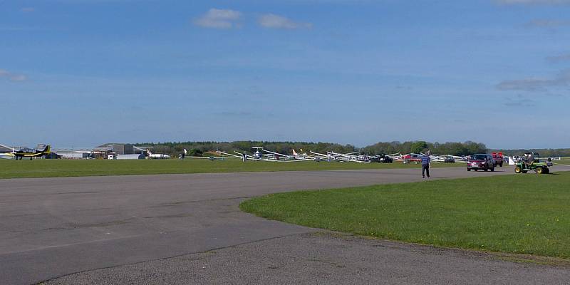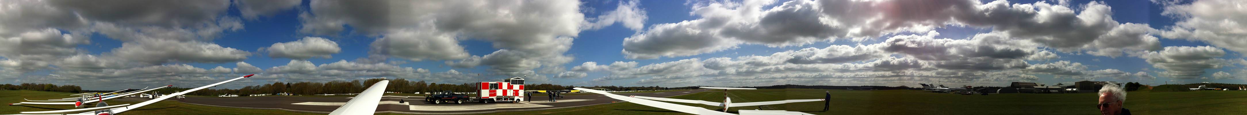 Flying above the T21. | Gliders towing back to the launch point fown below. | Cloudscape panorama. | Lasham Airfield from the East. | Vintage glider back on the ground. |