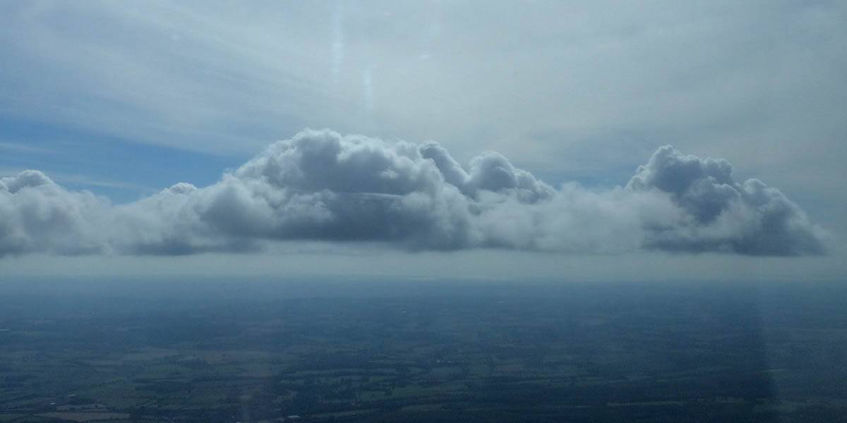 Thermals starting to form under top cover. | Soaring above runway 27. | Some nice cumulus over Alton to the South. | Some curious wisps of pileus like cloud just above cloudbase. |