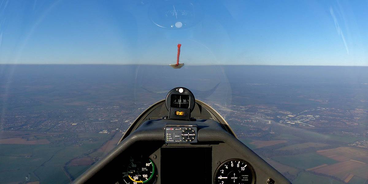 In the glider ready to winch launch. | Sunny cloudscape. | First FZ200 airborne shots. Cumulus hints of thermals in the air. | Another glider soaring up ahead. |