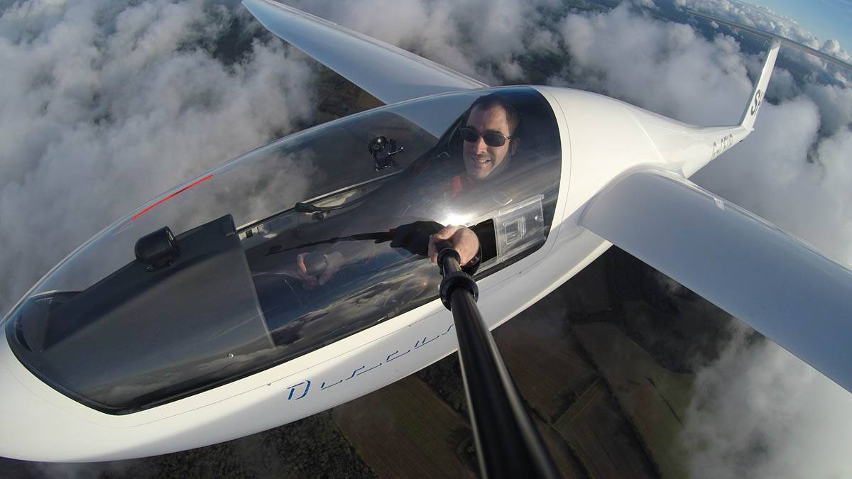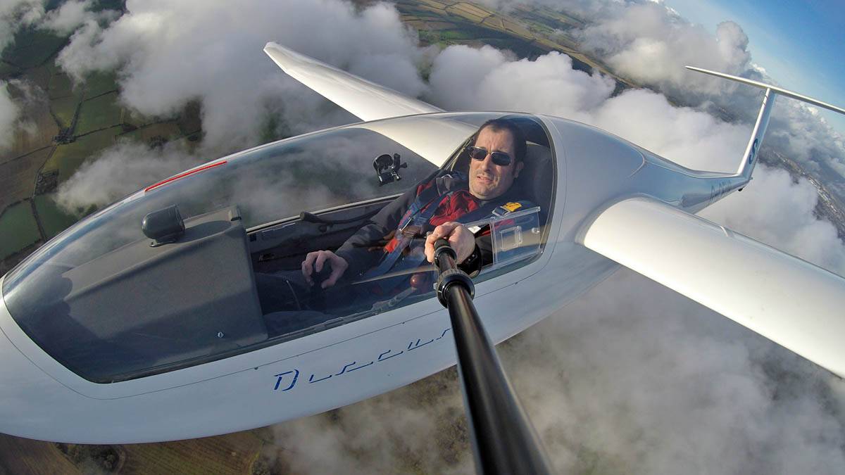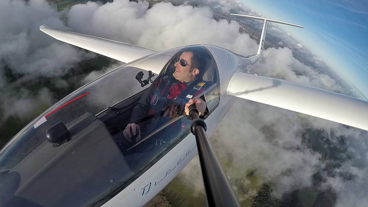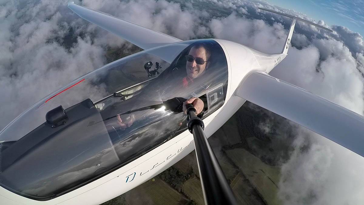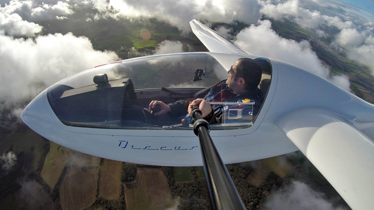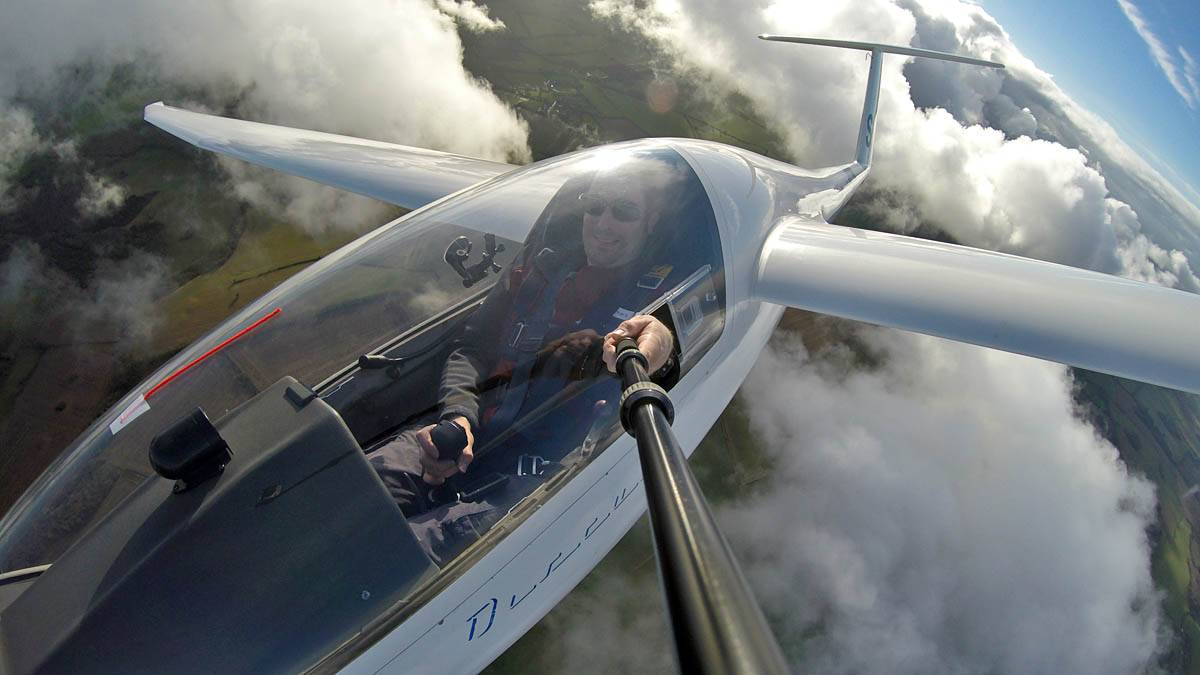 Testing out the selfie pole while waiting in the aerotow queue. | An arty shot of Nigel Pocock. The cloud looks like steam rising off his head. | Heavenly views from 4000 feet soon after I released from tow. | Deploying the selfie pole with the GoPro on the end. Glider trimmed and flying itself safely at 50kts. |