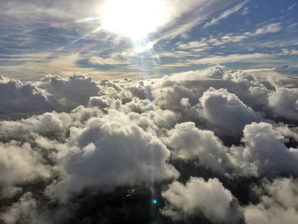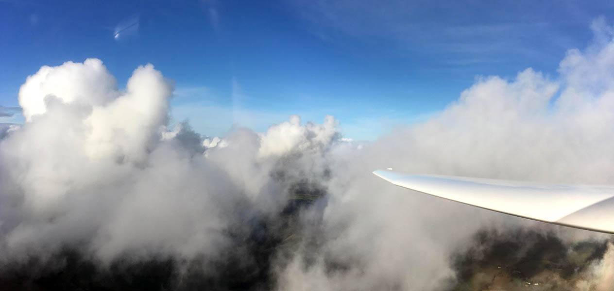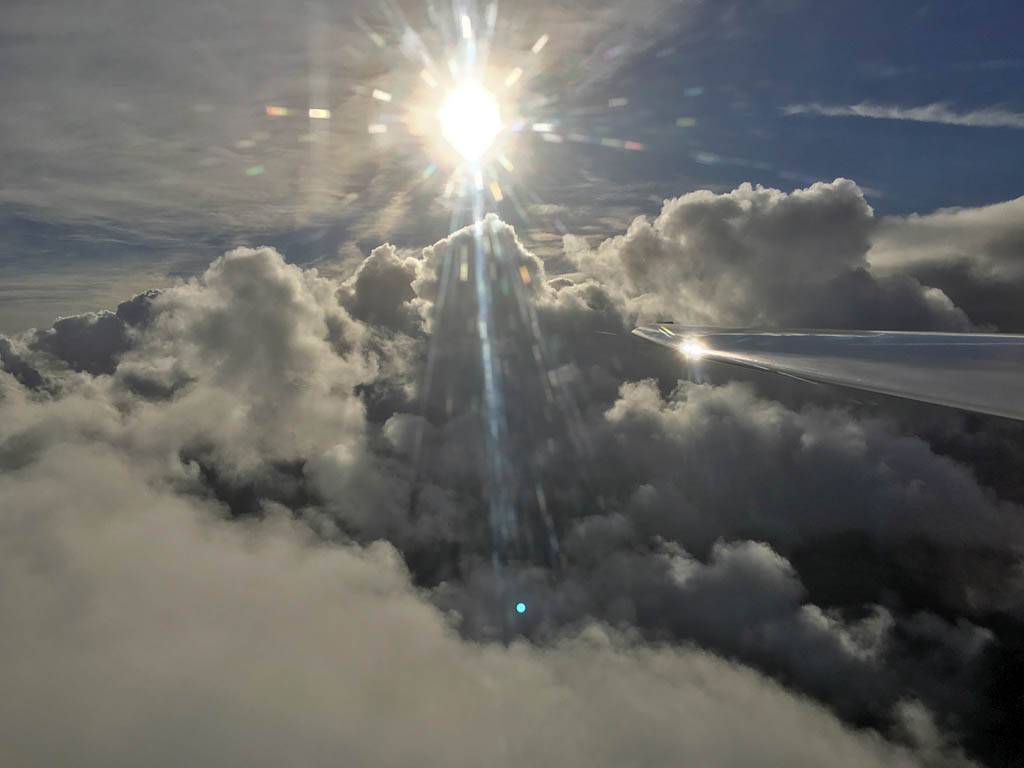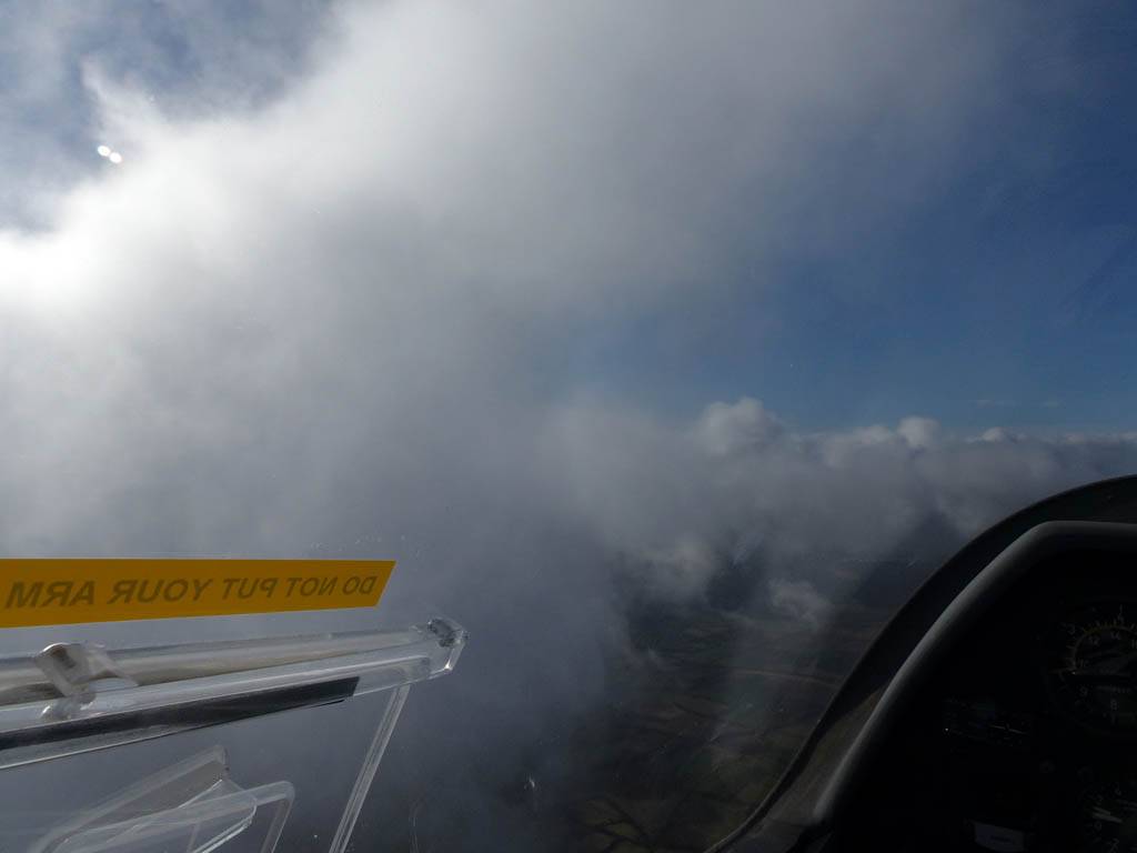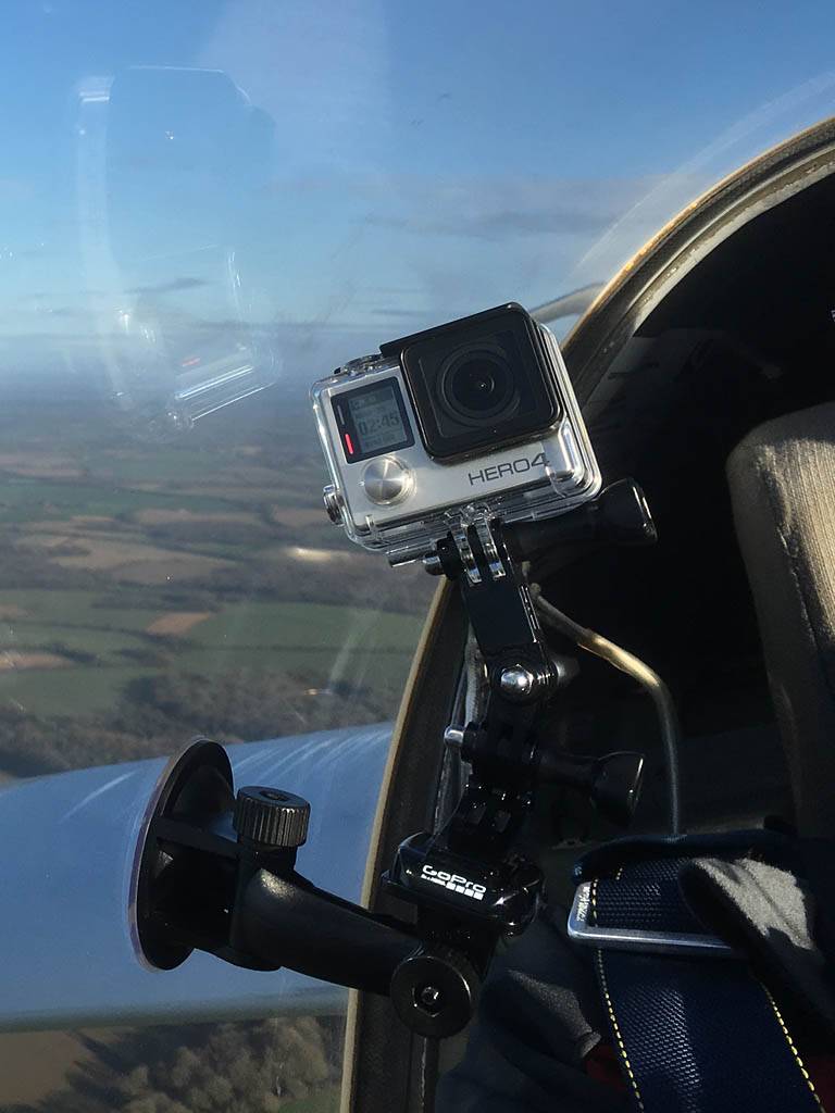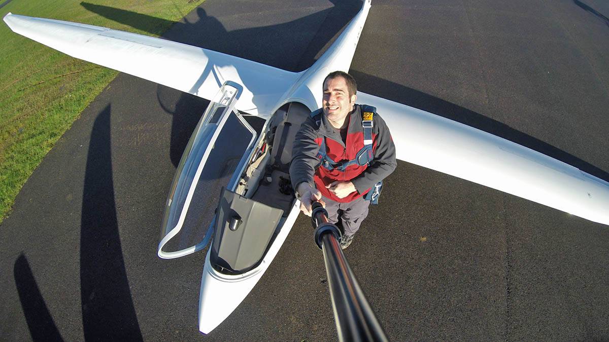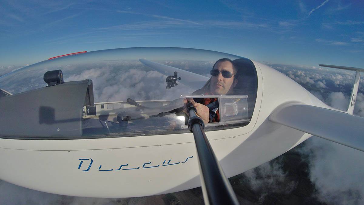 Testing out the selfie pole while waiting in the aerotow queue. | An arty shot of Nigel Pocock. The cloud looks like steam rising off his head. | Heavenly views from 4000 feet soon after I released from tow. | Deploying the selfie pole with the GoPro on the end. Glider trimmed and flying itself safely at 50kts. |