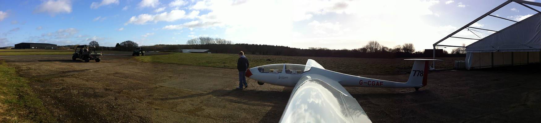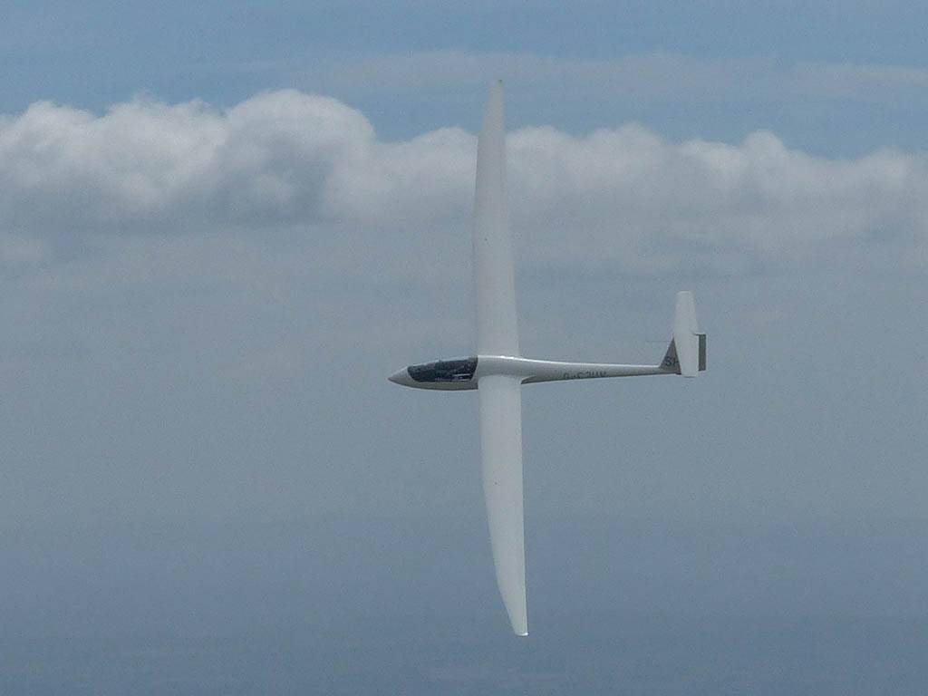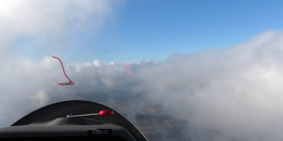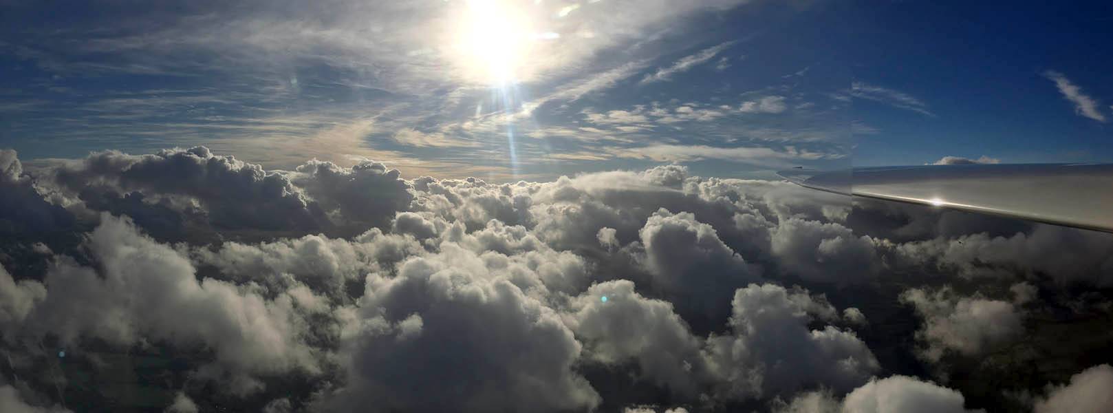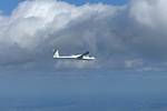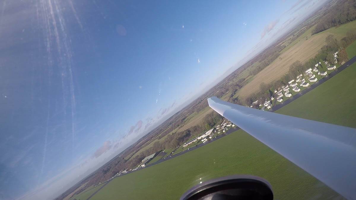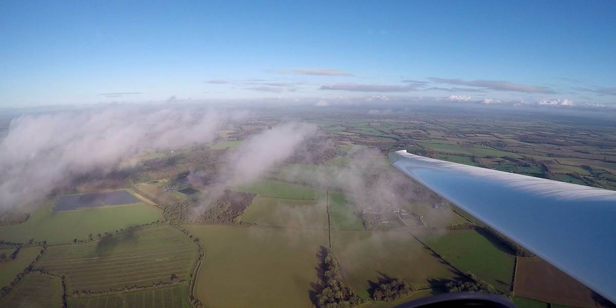 Testing out the selfie pole while waiting in the aerotow queue. | An arty shot of Nigel Pocock. The cloud looks like steam rising off his head. | Heavenly views from 4000 feet soon after I released from tow. | Deploying the selfie pole with the GoPro on the end. Glider trimmed and flying itself safely at 50kts. |