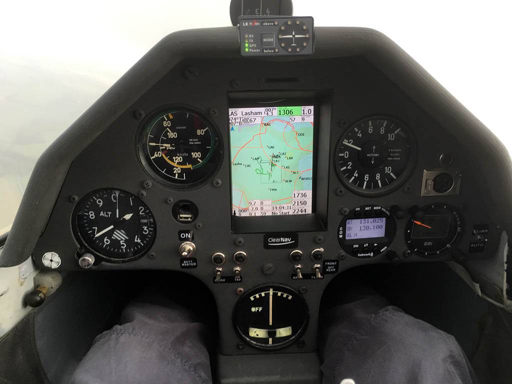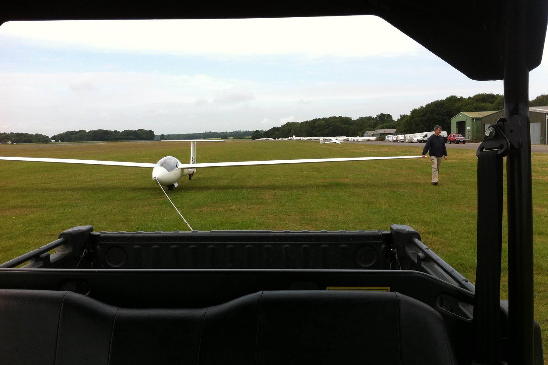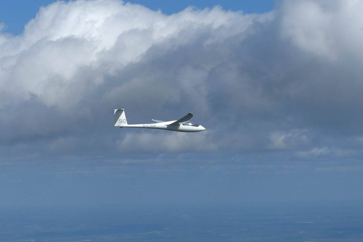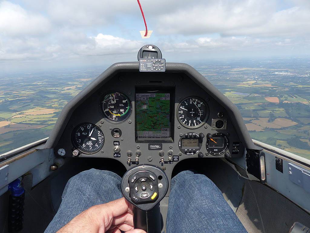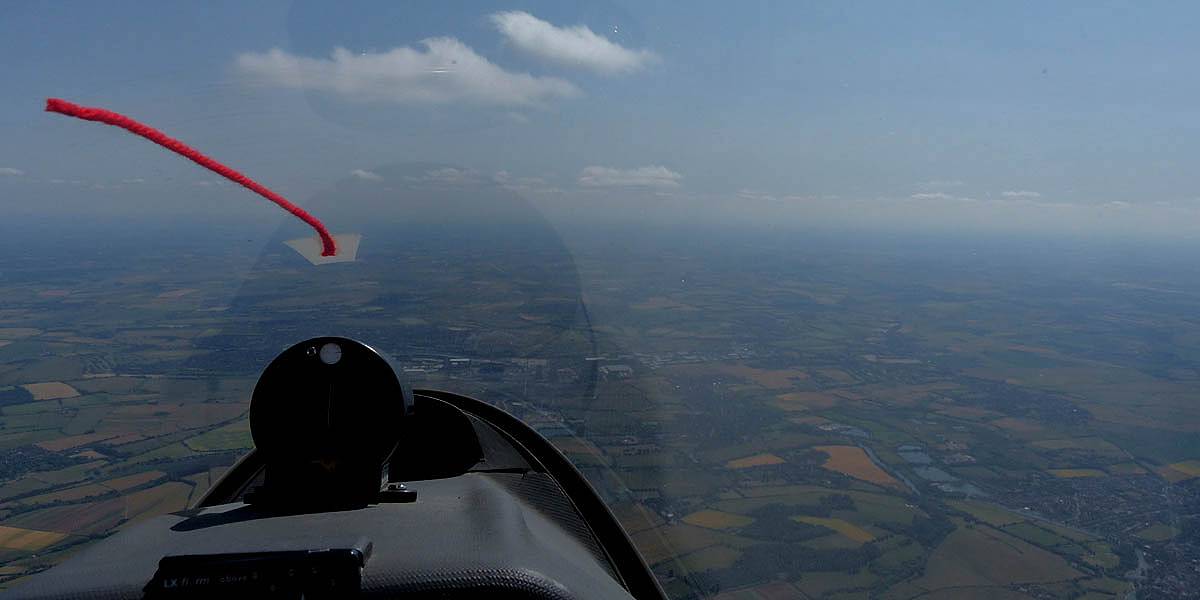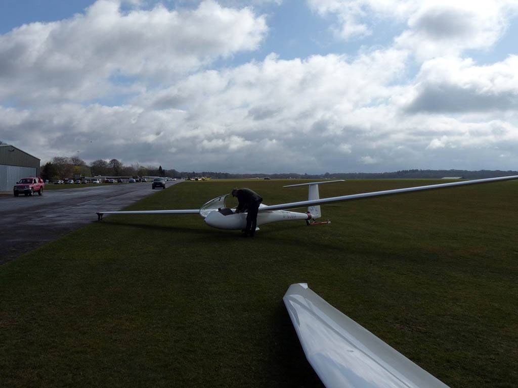 Testing out the selfie pole while waiting in the aerotow queue. | An arty shot of Nigel Pocock. The cloud looks like steam rising off his head. | Heavenly views from 4000 feet soon after I released from tow. | Deploying the selfie pole with the GoPro on the end. Glider trimmed and flying itself safely at 50kts. |
