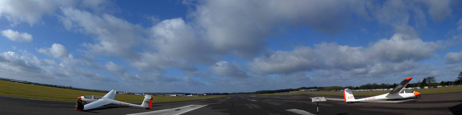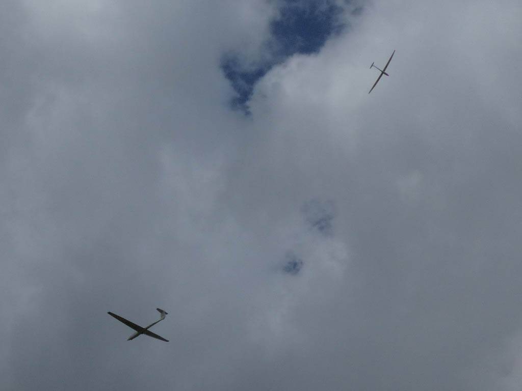 From a distance this looked like a single plane with 2 tails. The photo betrays that it is 2 fuselages though. | Getting ready to tow out as early rain clears and it brightens up rapidly. | Before long, as the launch point, the sky looks gorgeous. | Setting off Westwards along the monster cloud street once I thermal away to cloudbase off a winch launch. | Gorgeous sky to the North of the Lasham area too. |