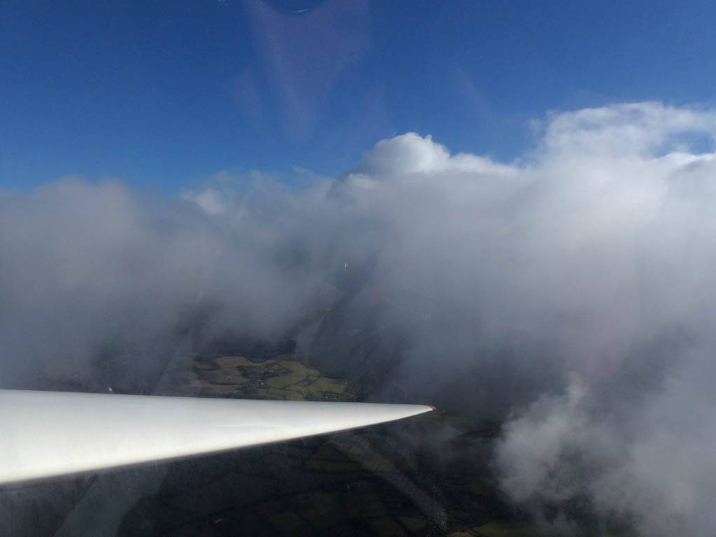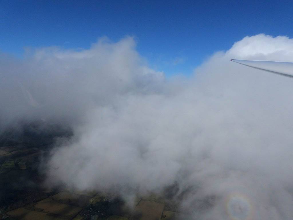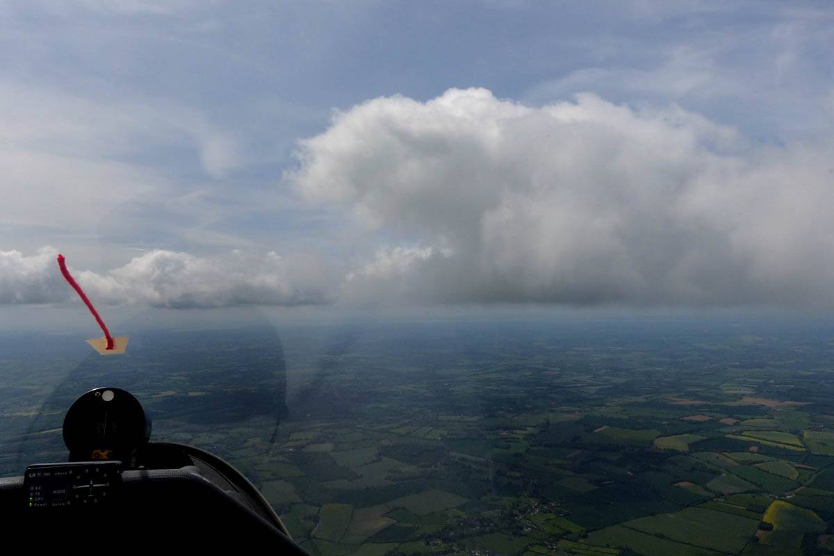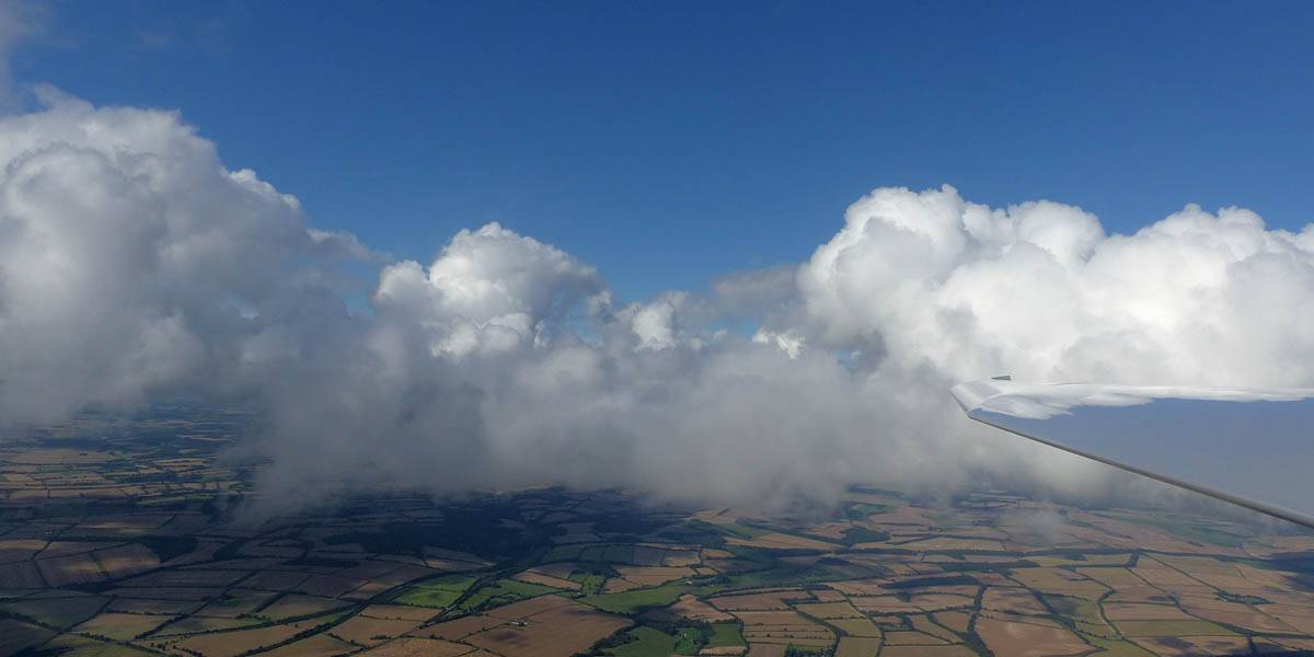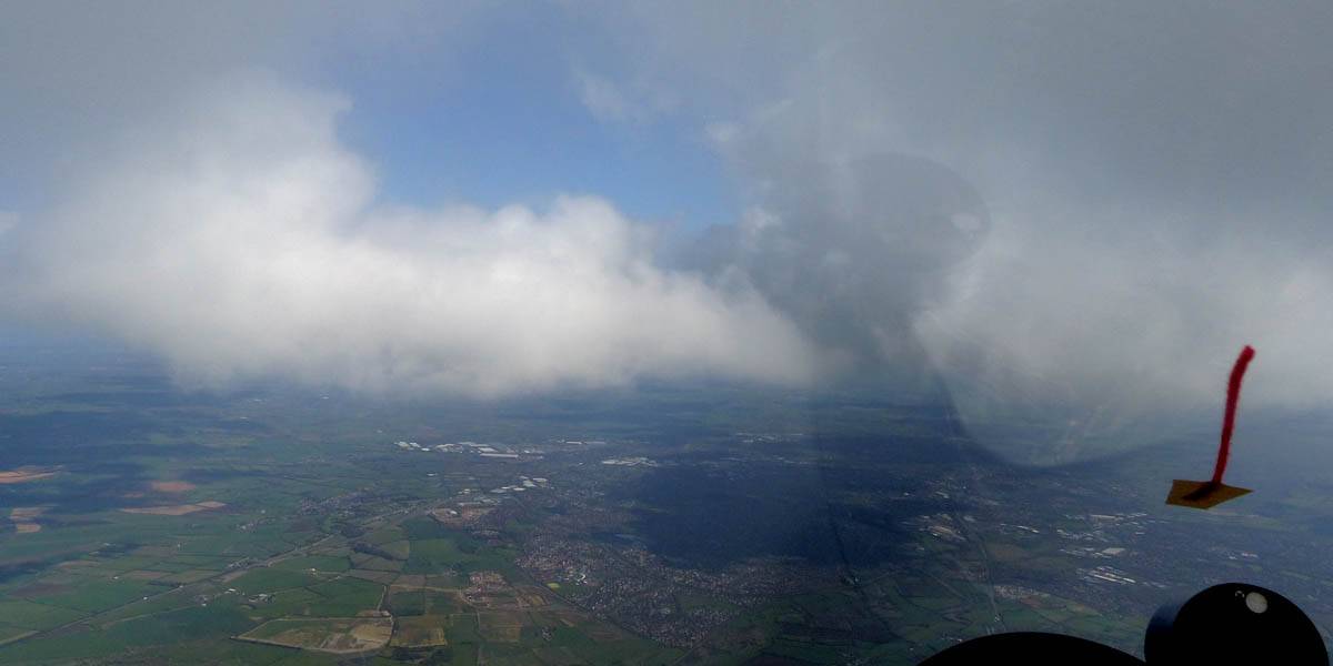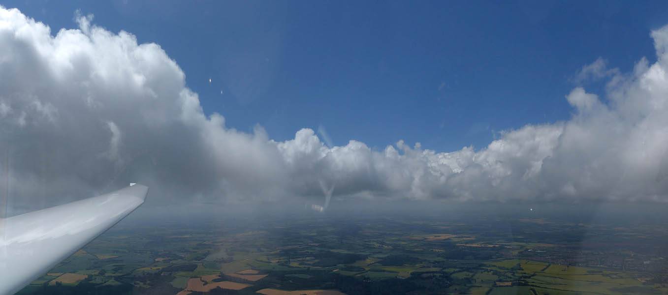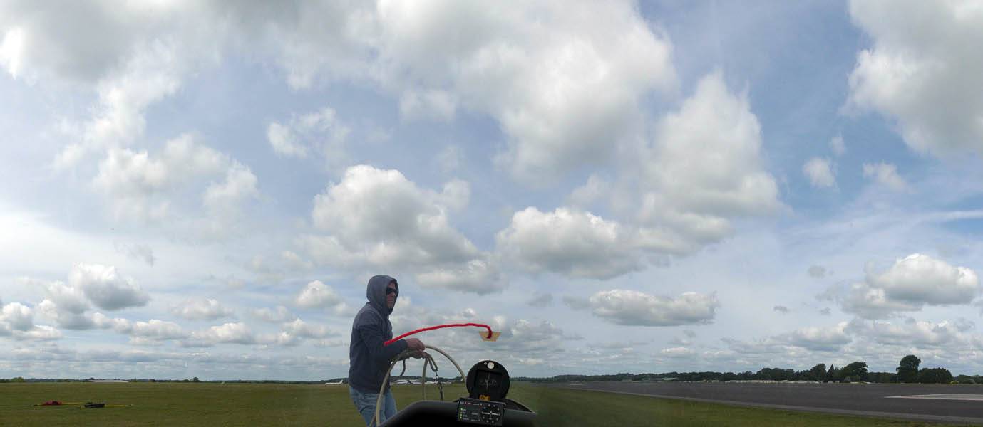 Catching some irridescence in a cumulus cloud by the airfield as I briefly play in patchy lift next to it. | Back on the ground looking at showers forming to the South. | In the queue for winch launch 2. | The mounted GoPro makes pictures during winch launch possible! | Views over cumulus to the North of the airfield. |