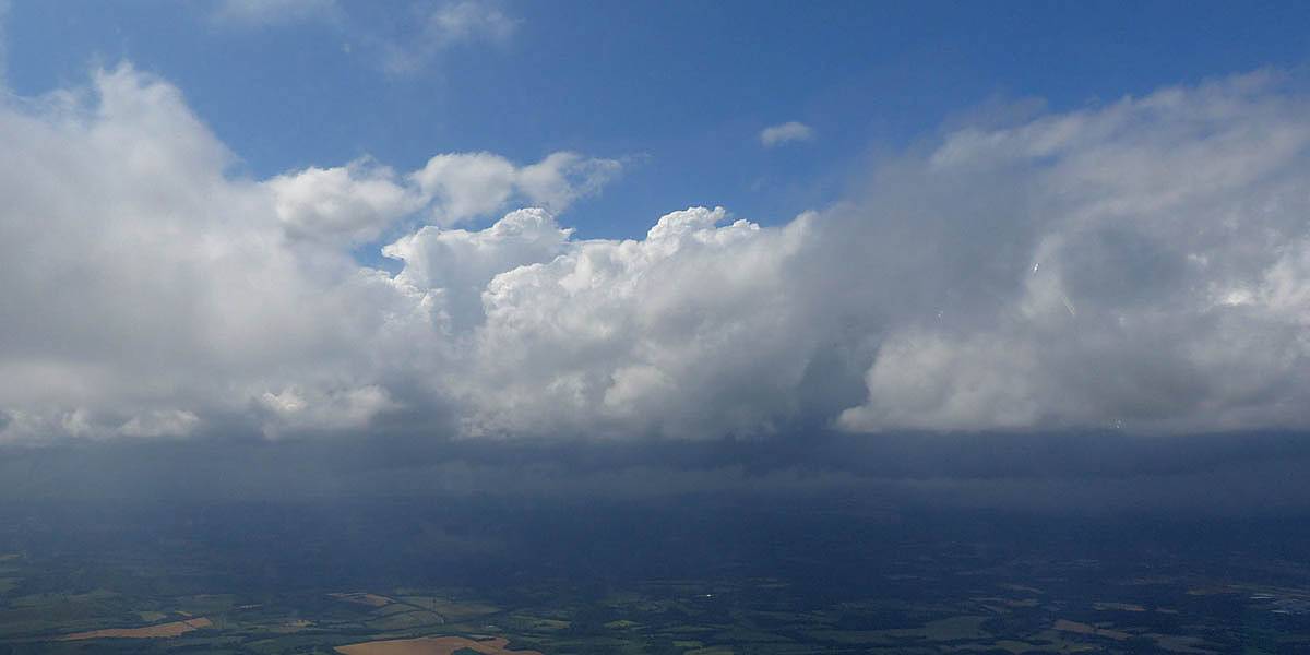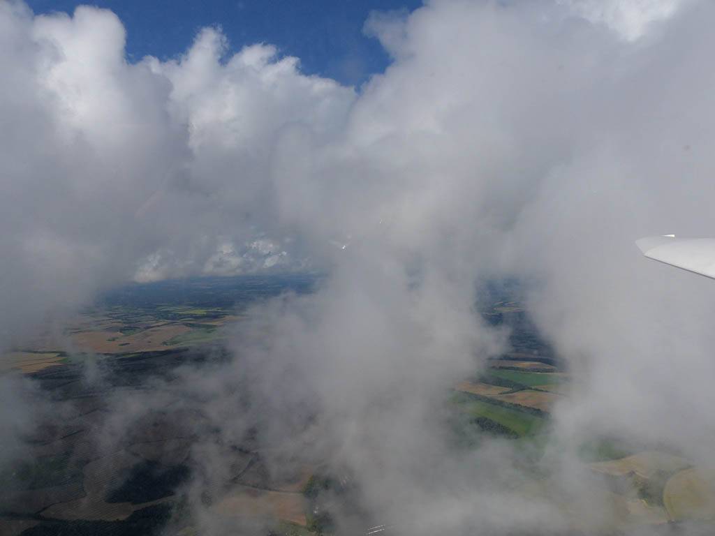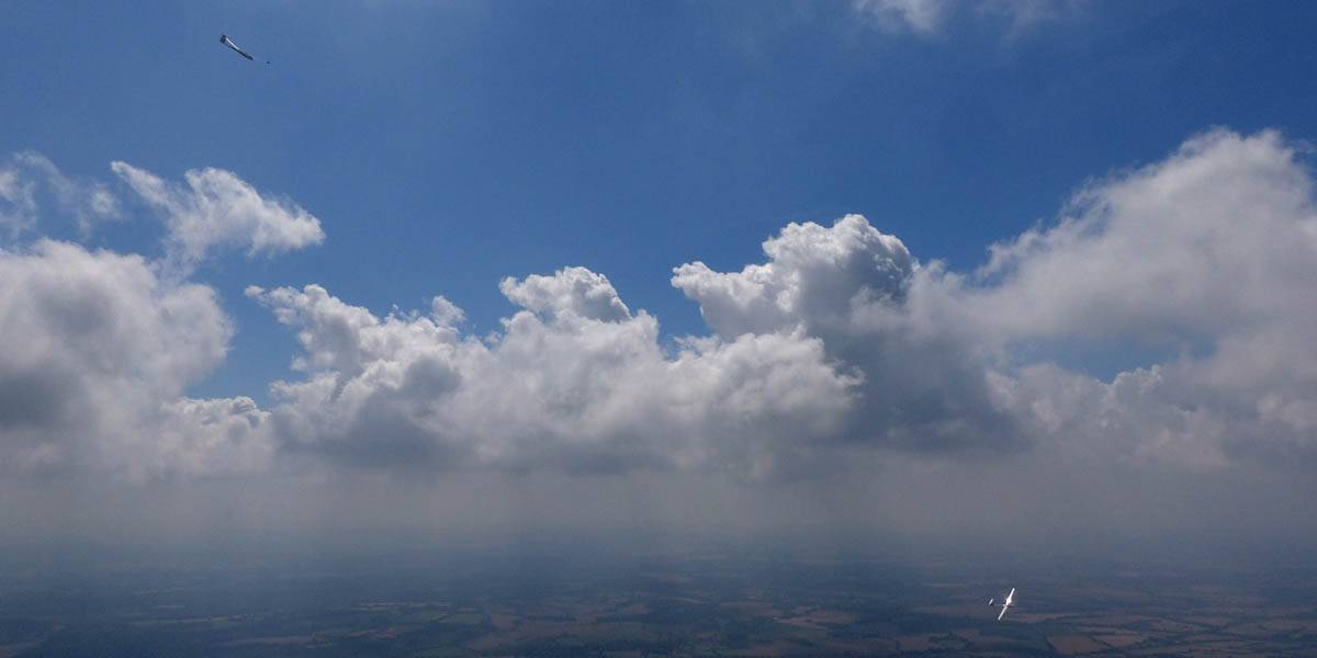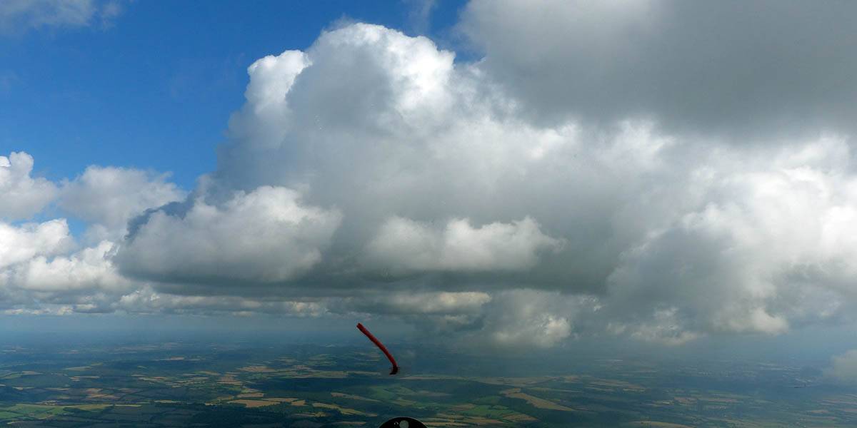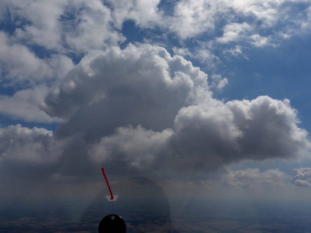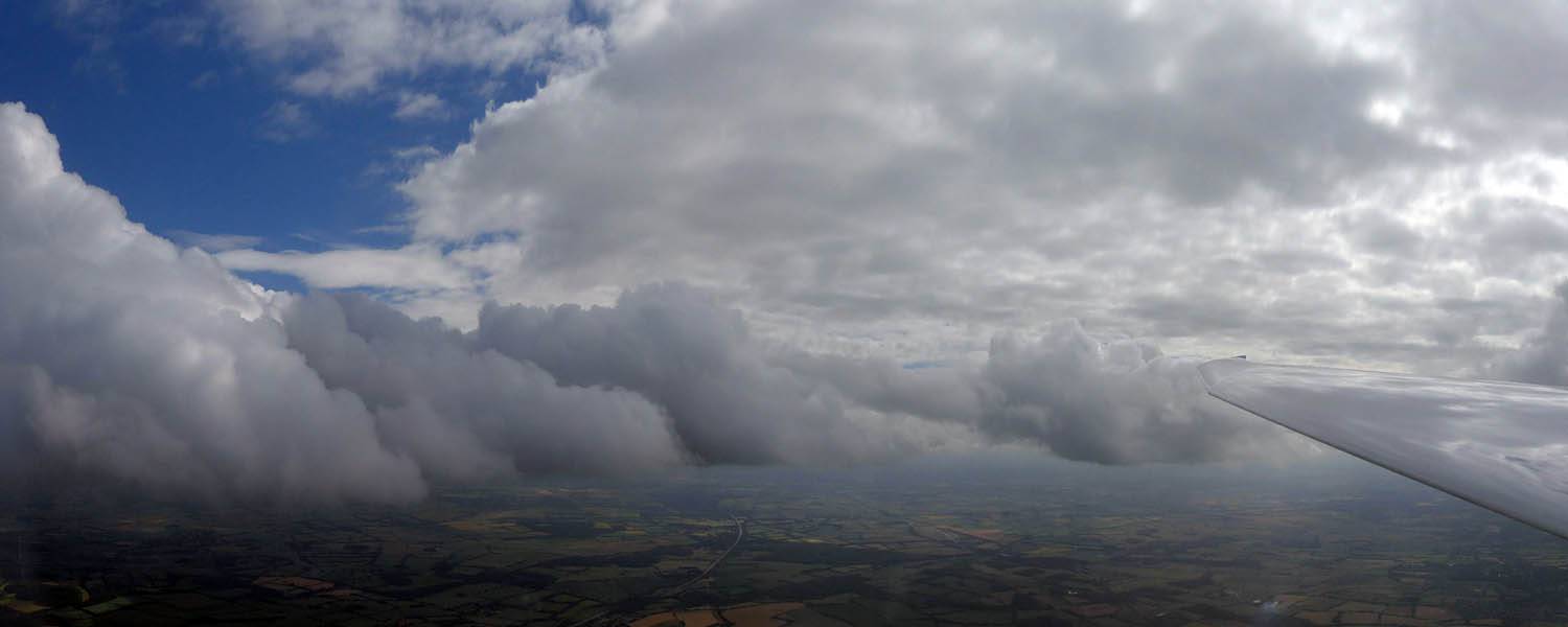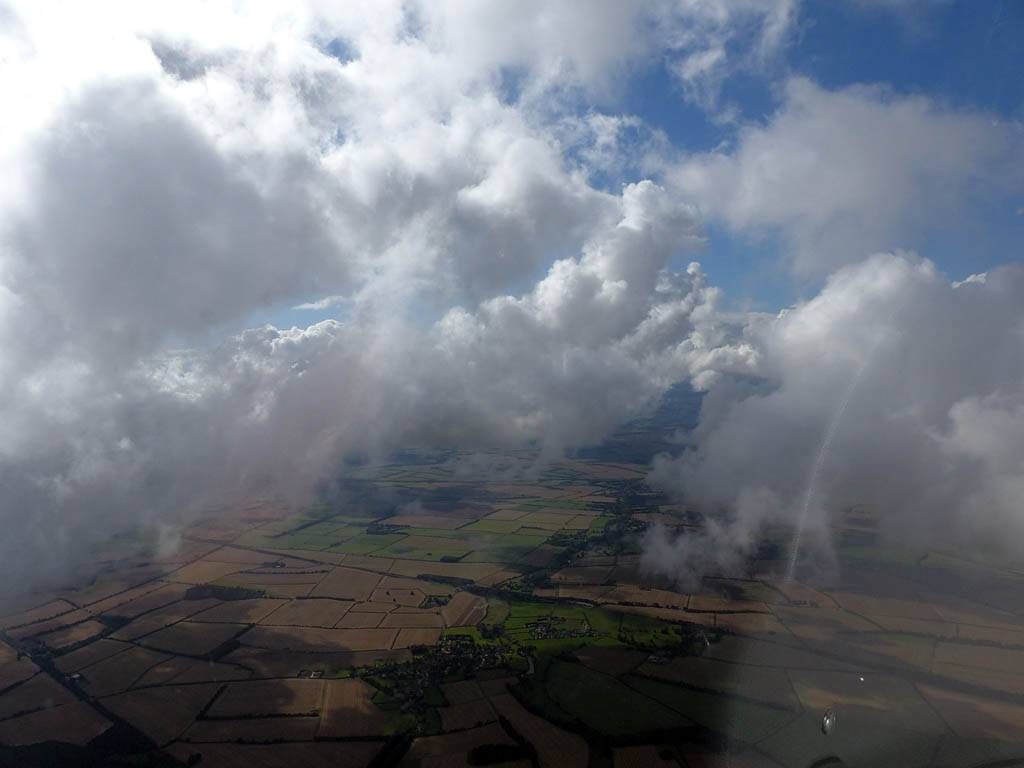 Catching some irridescence in a cumulus cloud by the airfield as I briefly play in patchy lift next to it. | Back on the ground looking at showers forming to the South. | In the queue for winch launch 2. | The mounted GoPro makes pictures during winch launch possible! | Views over cumulus to the North of the airfield. |